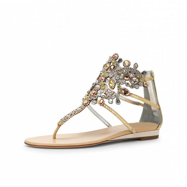 Gold Flip-Flops Wedding Sandals with Colorful Rhinestones