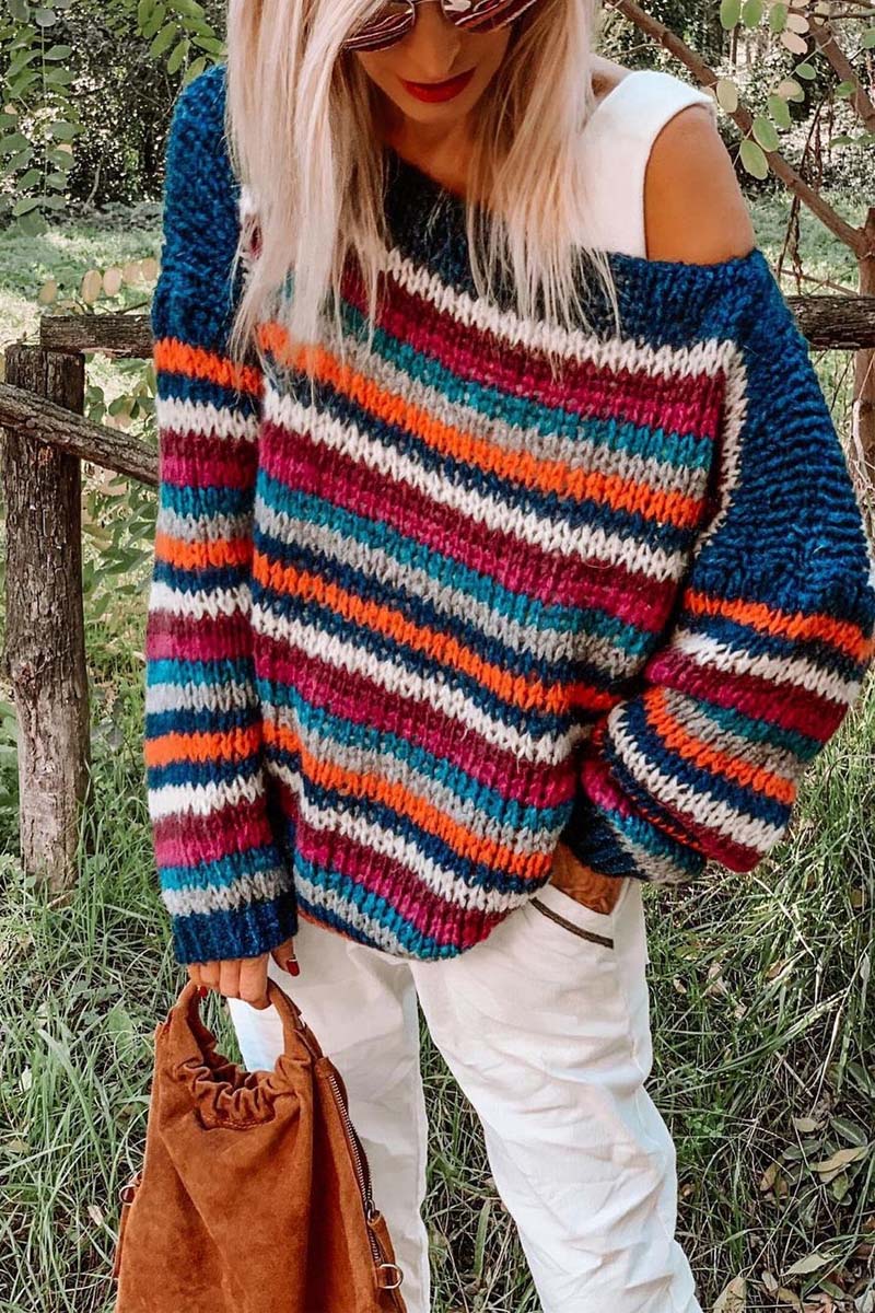 Loose Round Neck Rainbow Striped Sweater
