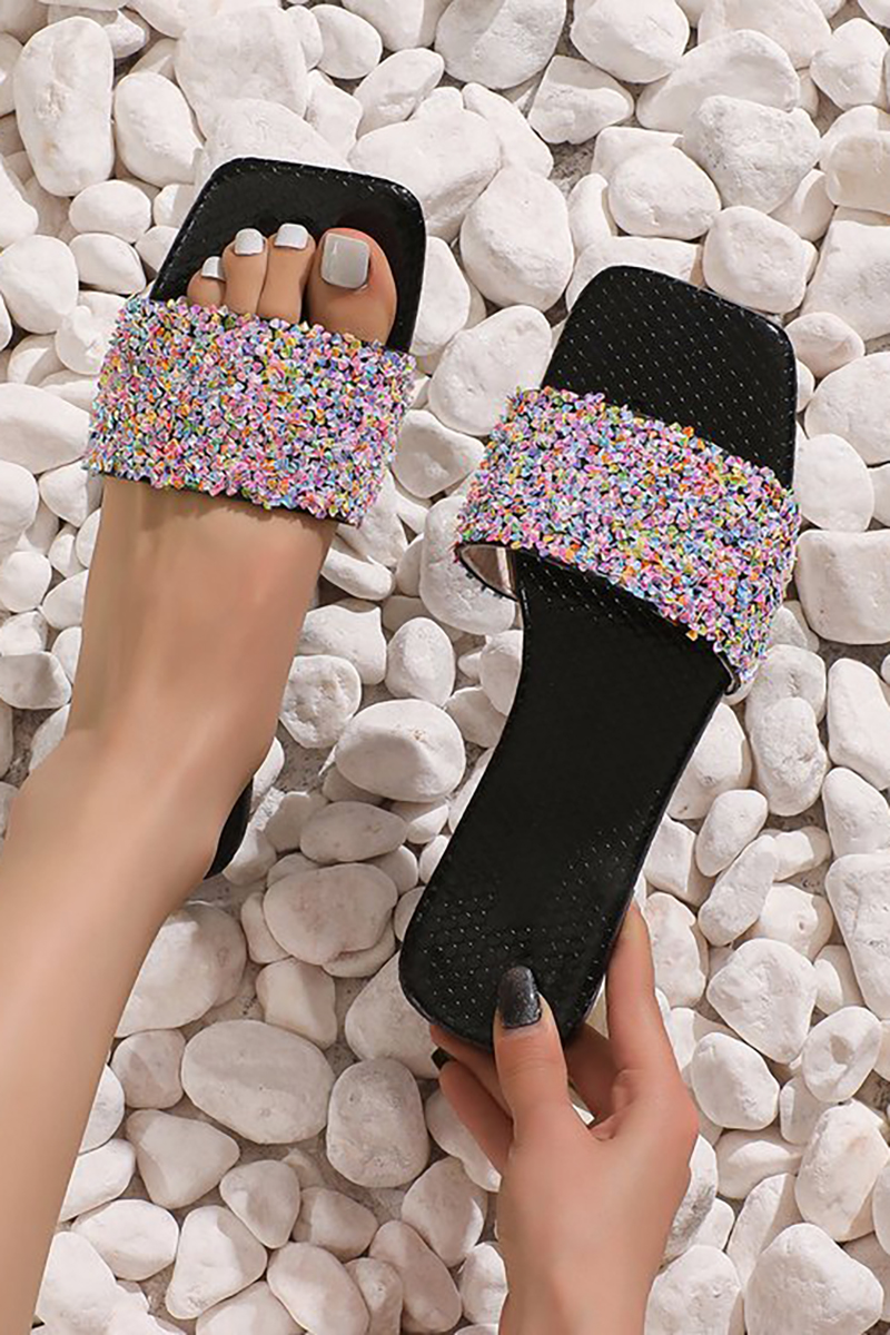 Rainbow Sequin Decor Slip On Square Toe Casual Slippers