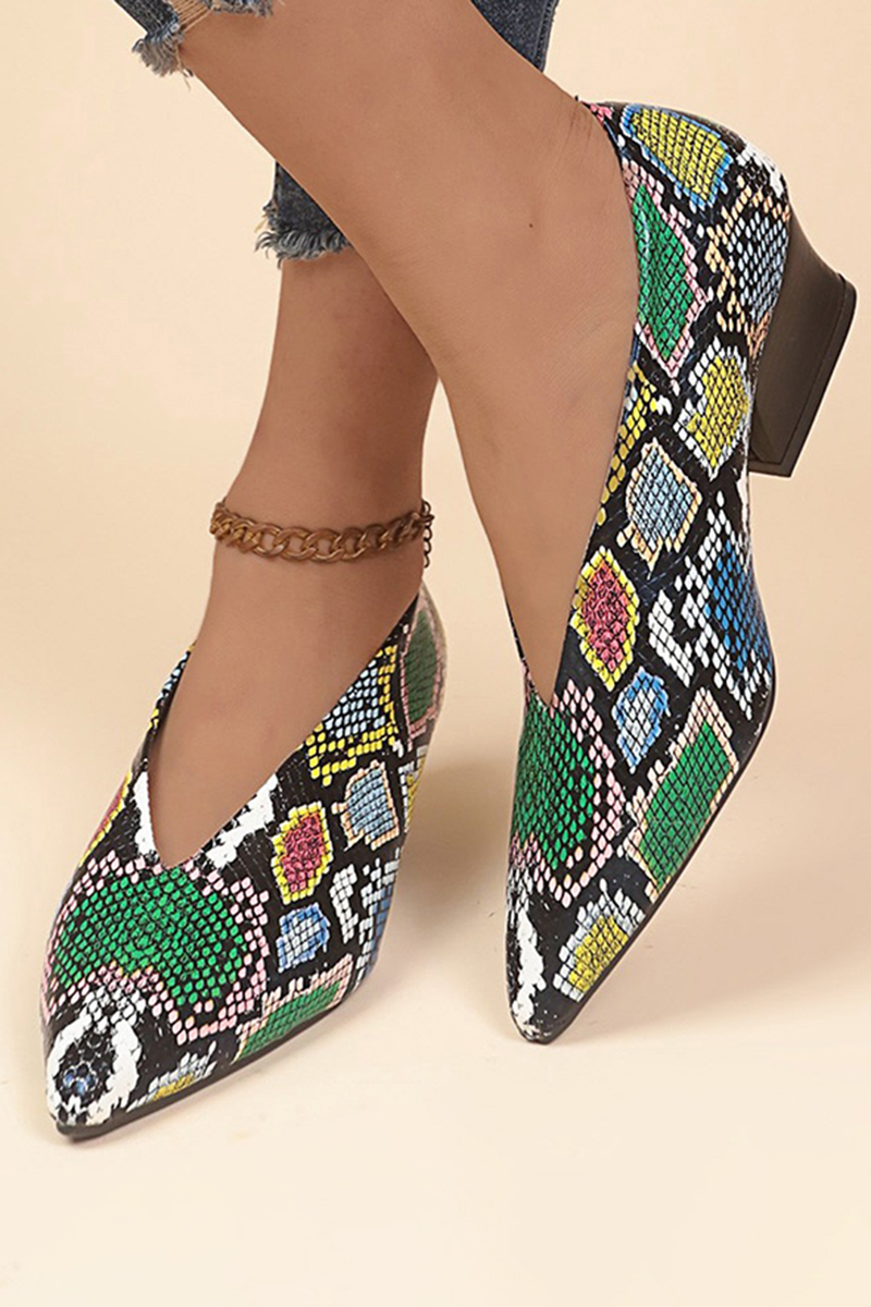 Snake Pattern Print Solid Color Pointy Toe Low Block Heels