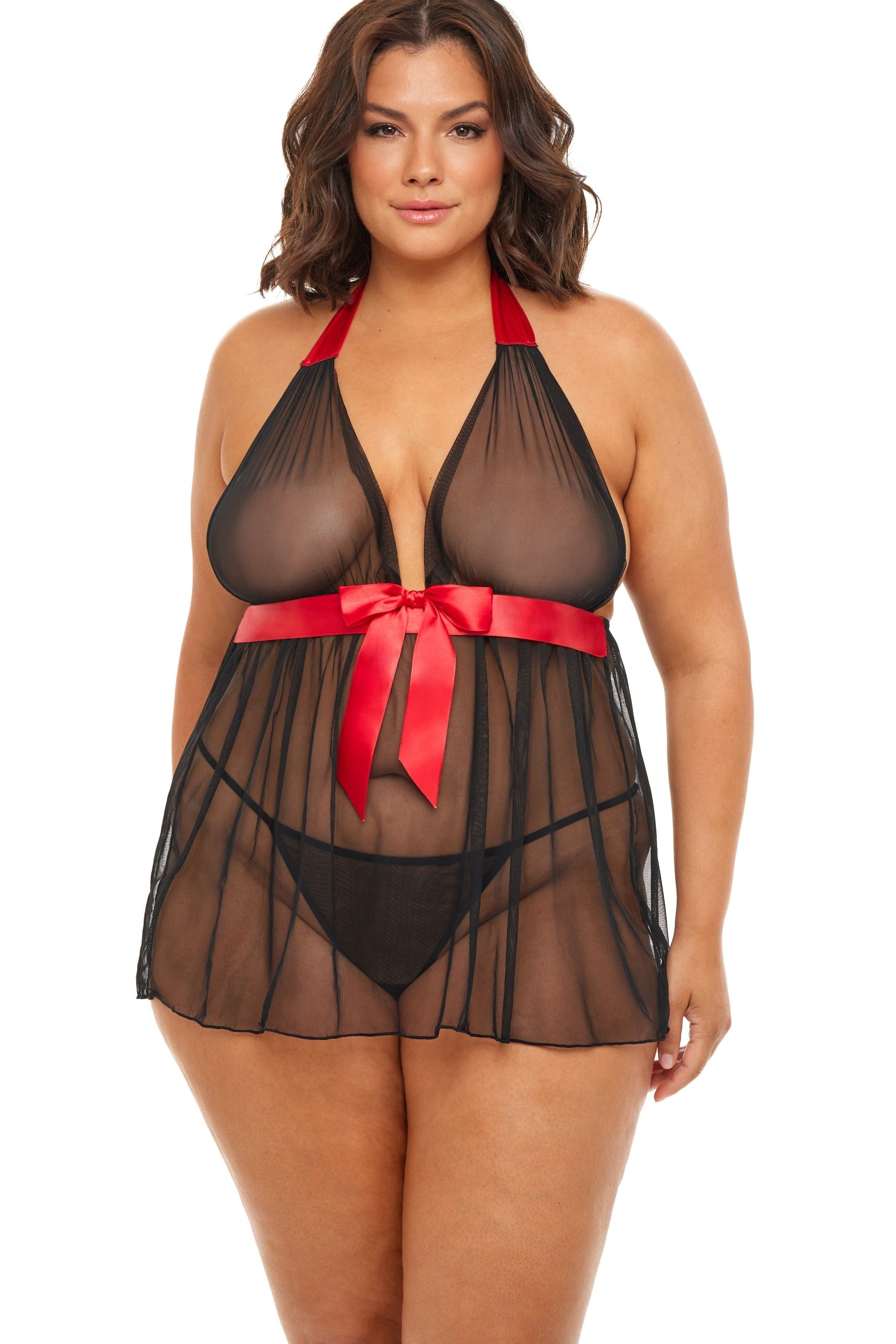 Plus Size Mesh Halter Babydoll With Satin Waist Bow Tie