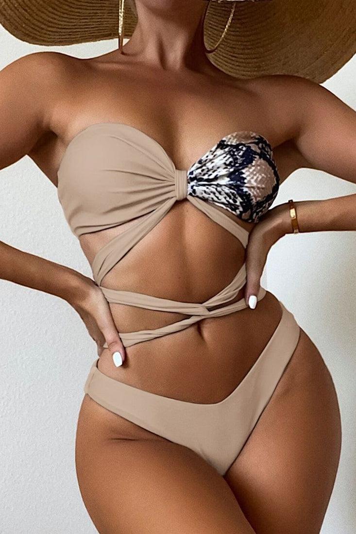 Beige Snake Print Strappy Two Piece Swimsuit