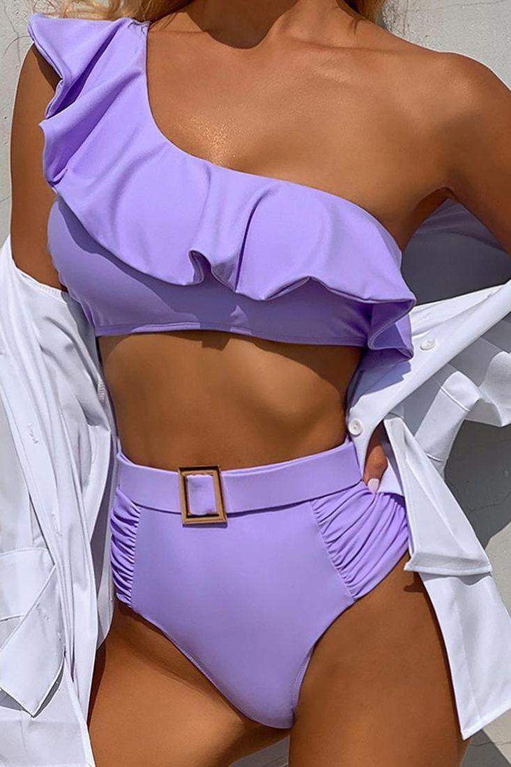 Purple One Shoulder Ruffled Belted High Waist Two Piece Swimsuit