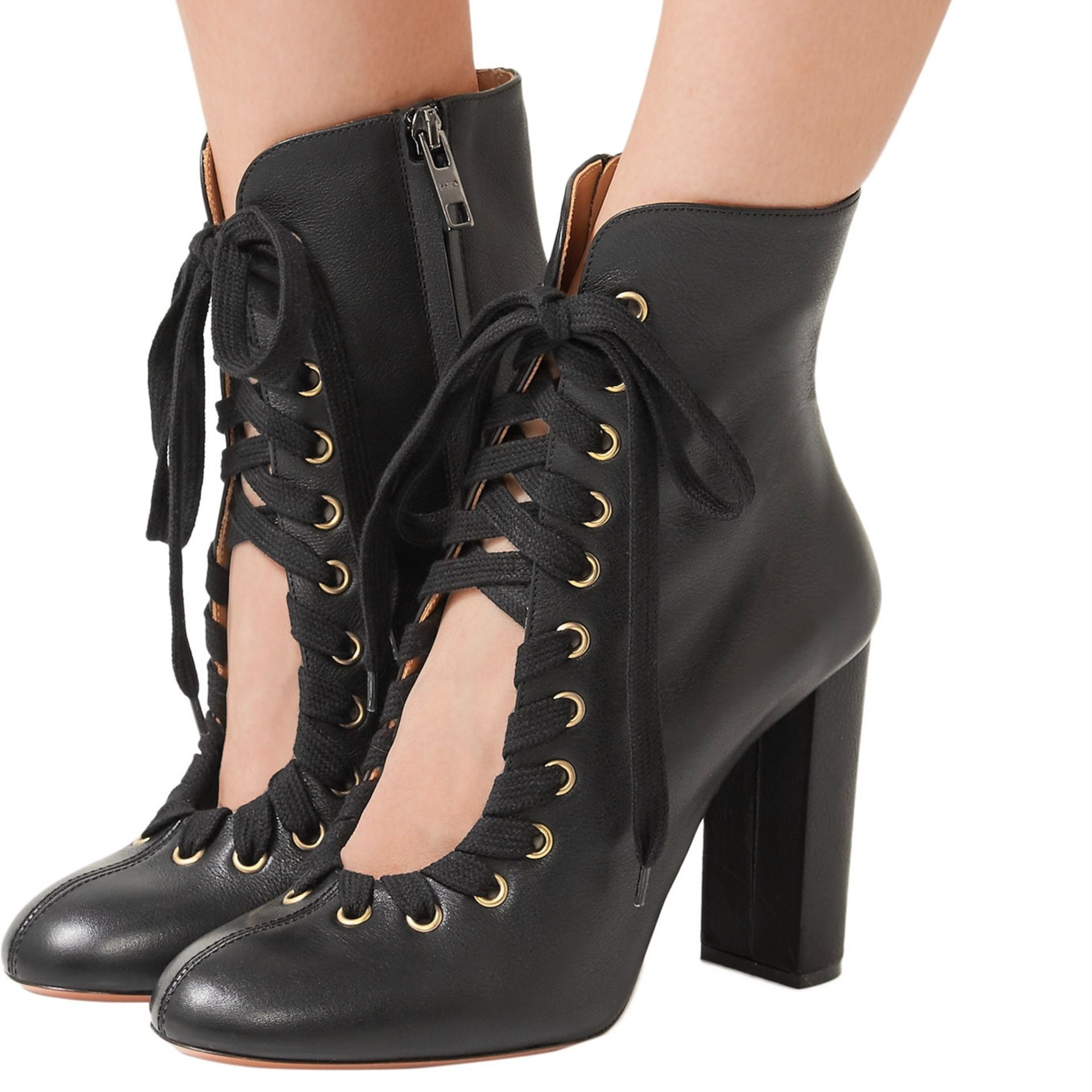 Black Round Toe Chunky Heel Booties Cut Out Lace Up Boots for Women