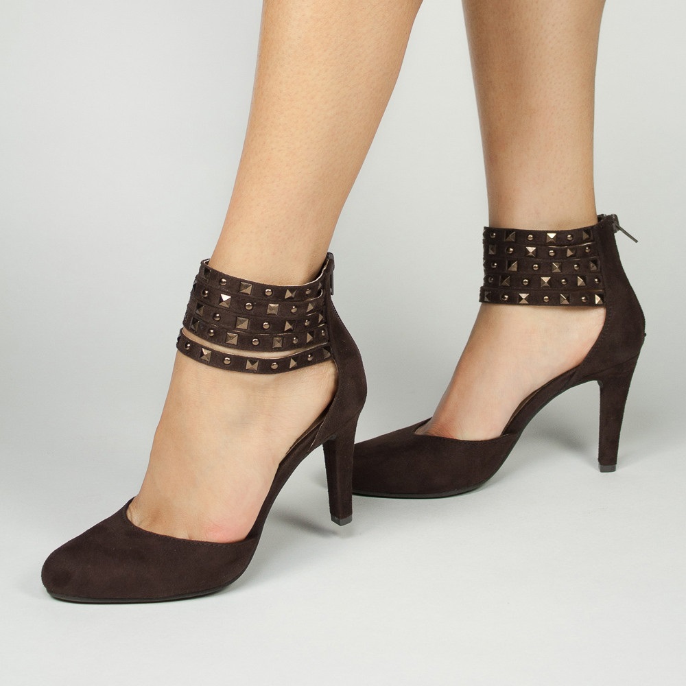 Dark Brown Vegan Suede Studs Ankle Strap Heels Pumps