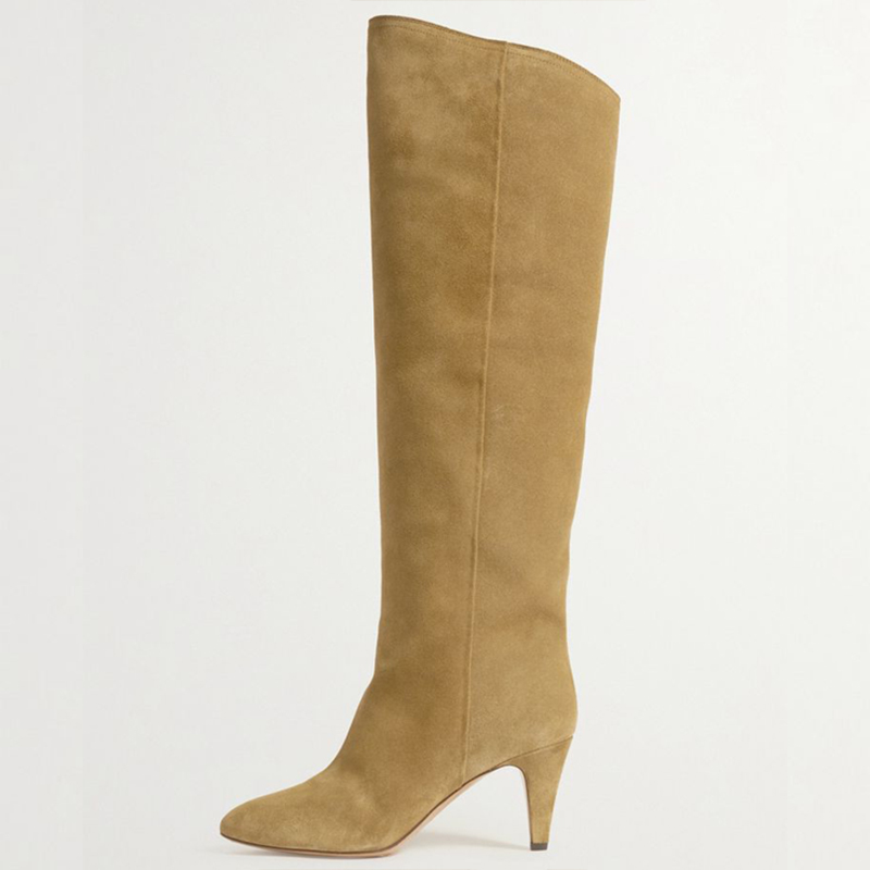 Yellow Pointed Vegan Suede Boot Women'S Classic Kitten Heel Shoes Vintage Knee Boots
