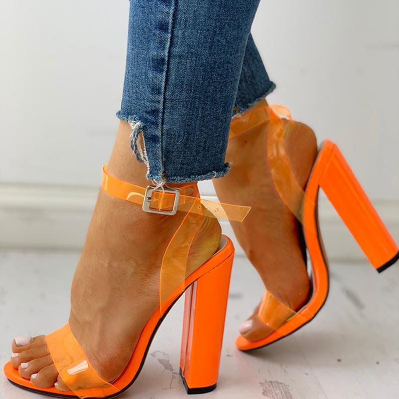 Orange Transparent Heels Classic Ankle Strap Sandals Chunky Heel Shoes