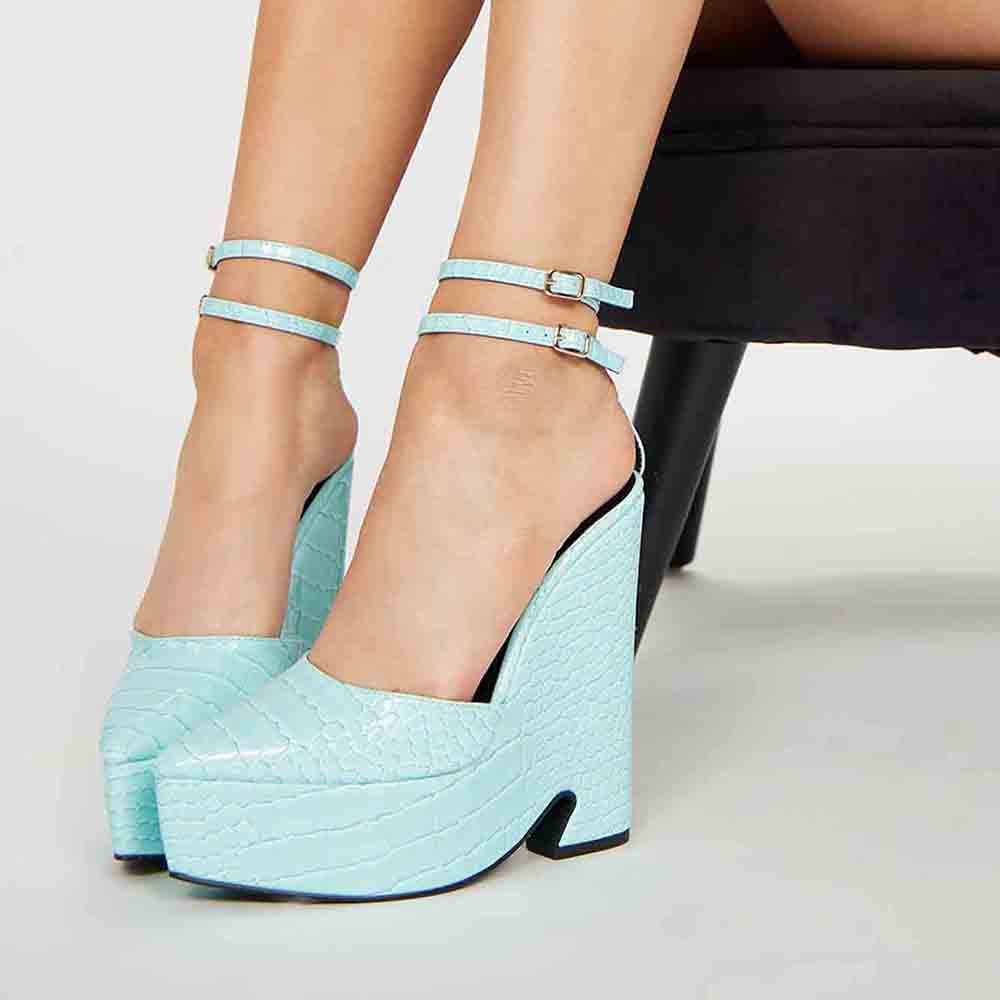 Turquoise Croco Embossed Pointed Toe Wedge Ankle Strap Platform Pumps