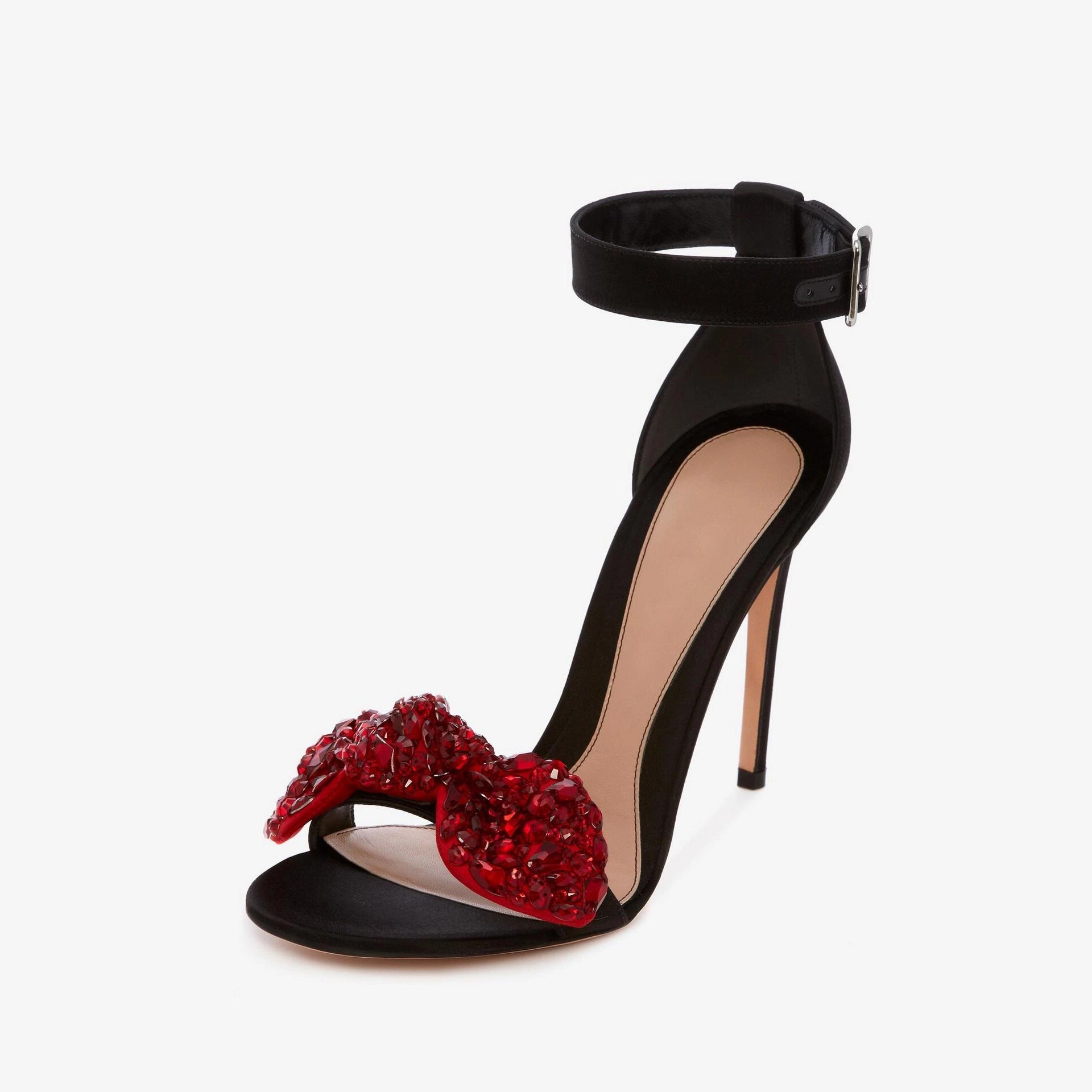 Red Rhinestone Bow Stiletto Heels Buckle Ankle Strap Sandals