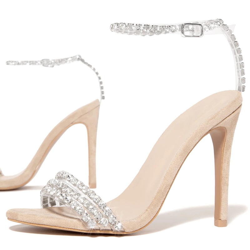 Nude Vegan Suede transparent Ankle Strap Sandals Rhinestone Stiletto Heel Sandals