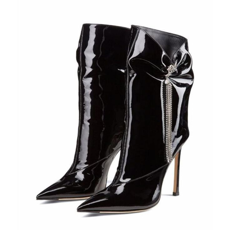 Black Pointed Stiletto Boots Classic Rhinestones Patent Heels Elegant Mid-Calf Boots