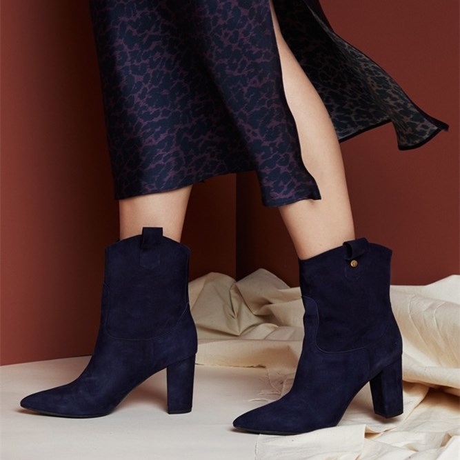 Navy Vegan Suede Chunky Heel Boots Pointy Toe Ankle Boots