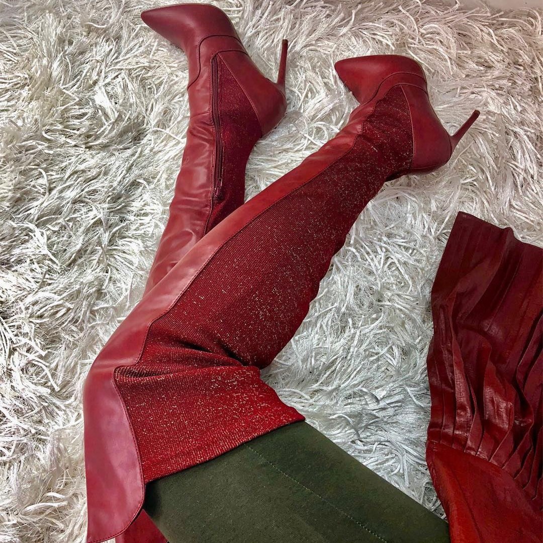 Dark Red Thigh High Heel Boots for Women