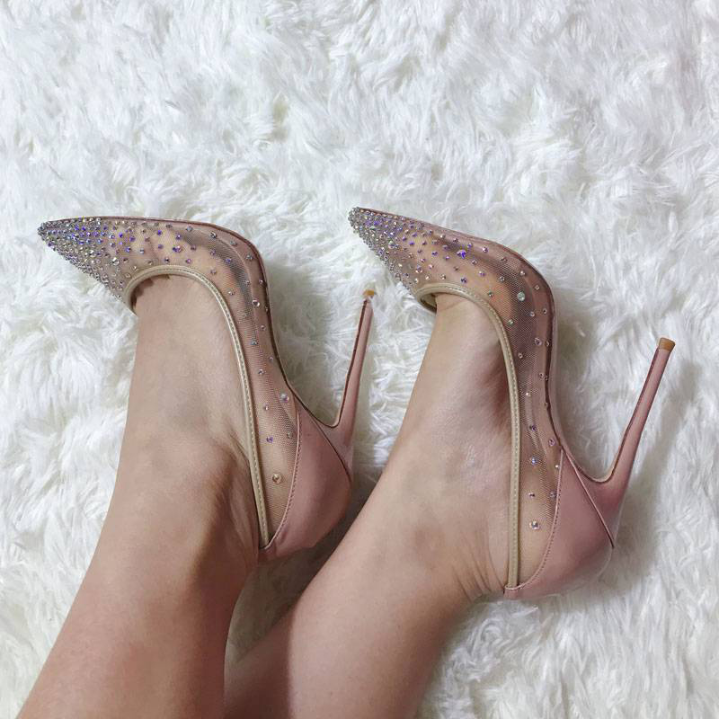 Blush Patent Stiletto Heels Pointed Toe transparent Shoes Rhinestones Pumps