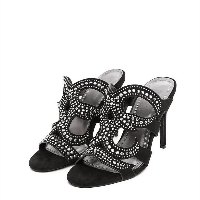Black Hollow out Mule Heels Stiletto Heels Sandals with Rhinestone
