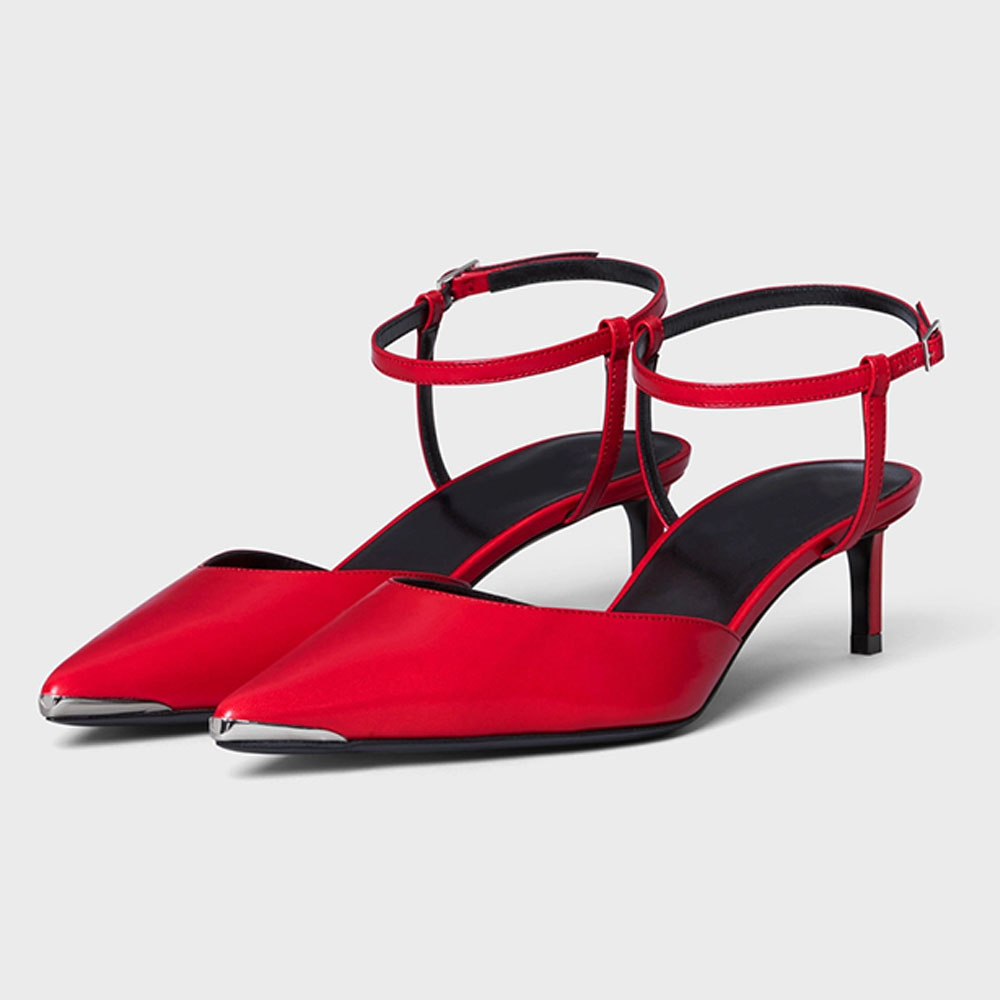Red Pointed Toe Mules Ankle Strap Kitten Heel Pumps for Women