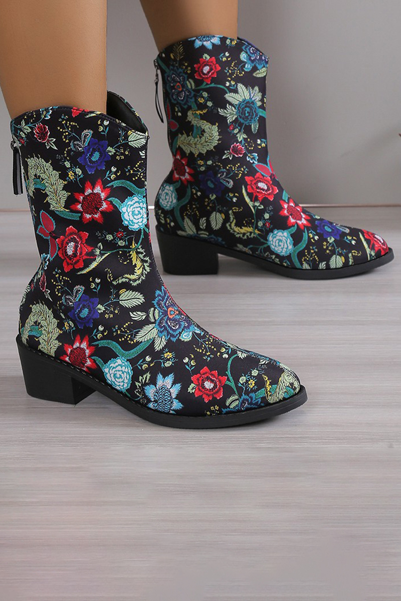 Floral All Over Print Zipper Chunky Heels Mid Calf Boots