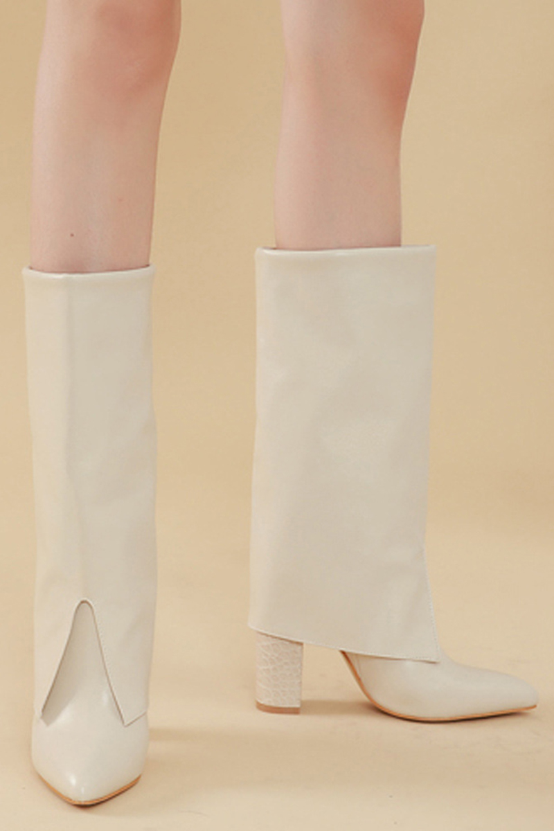 Solid Color Fold Over Crocodile Print Chunky Heels Mid Calf Boots