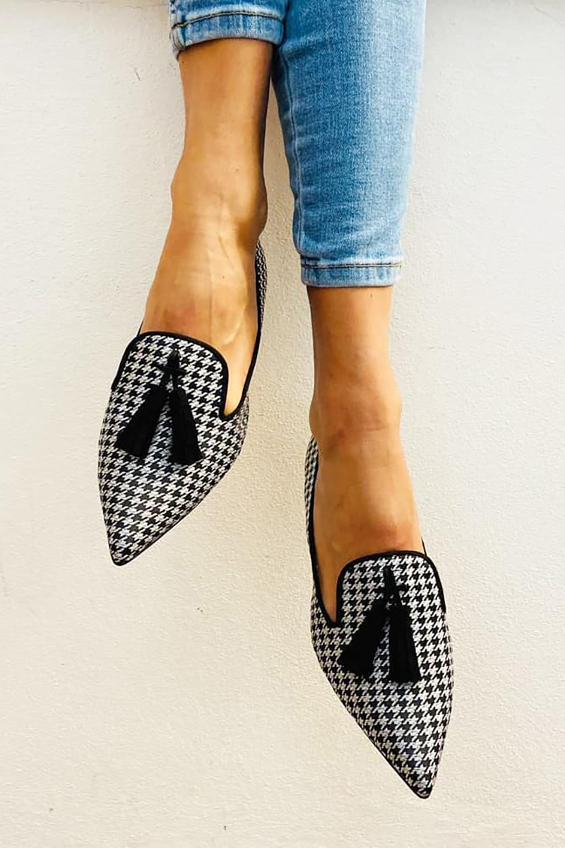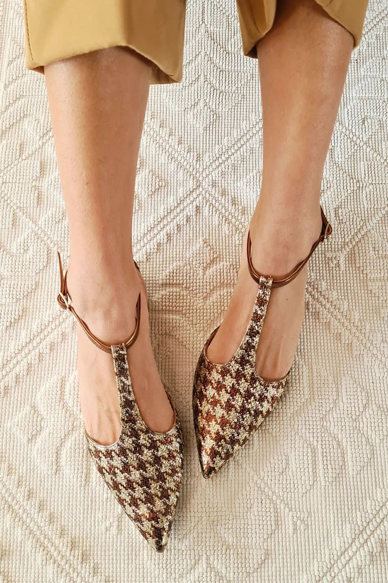 Houndstooth Pattern T-Strap Pointy Toe Casual Flats