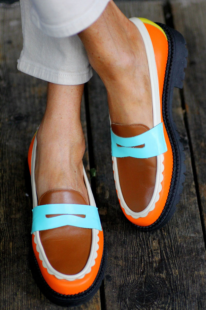 Color Block Patchwork Low Block Heels Round Toe Orange Loafers Pre Order
