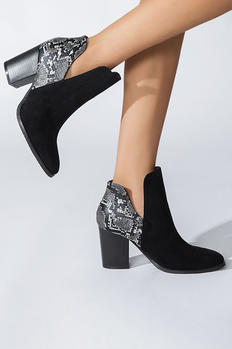 Snakeskin Patchwork Faux Suede Chunky Heel Slit Ankle Boots