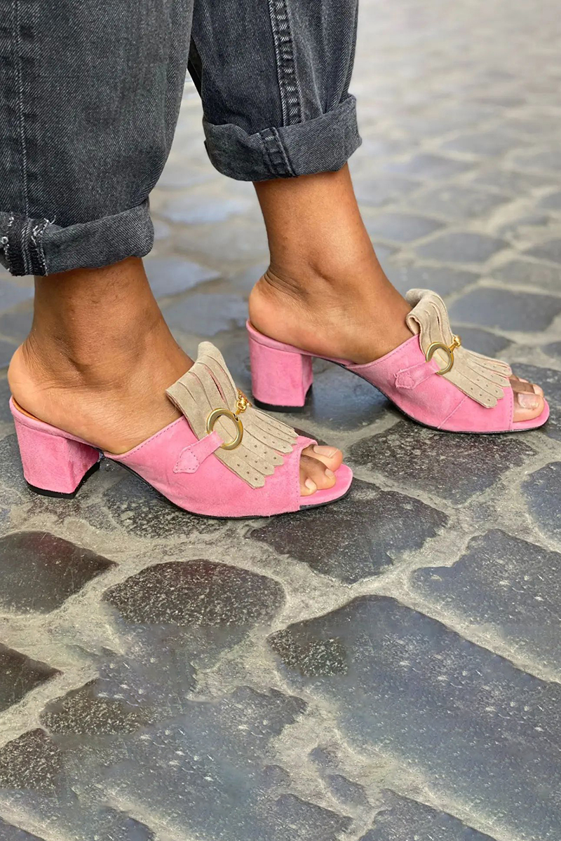 Colorblock Fringe Trim Metallic Buckle Peep Toe Chunky Heels