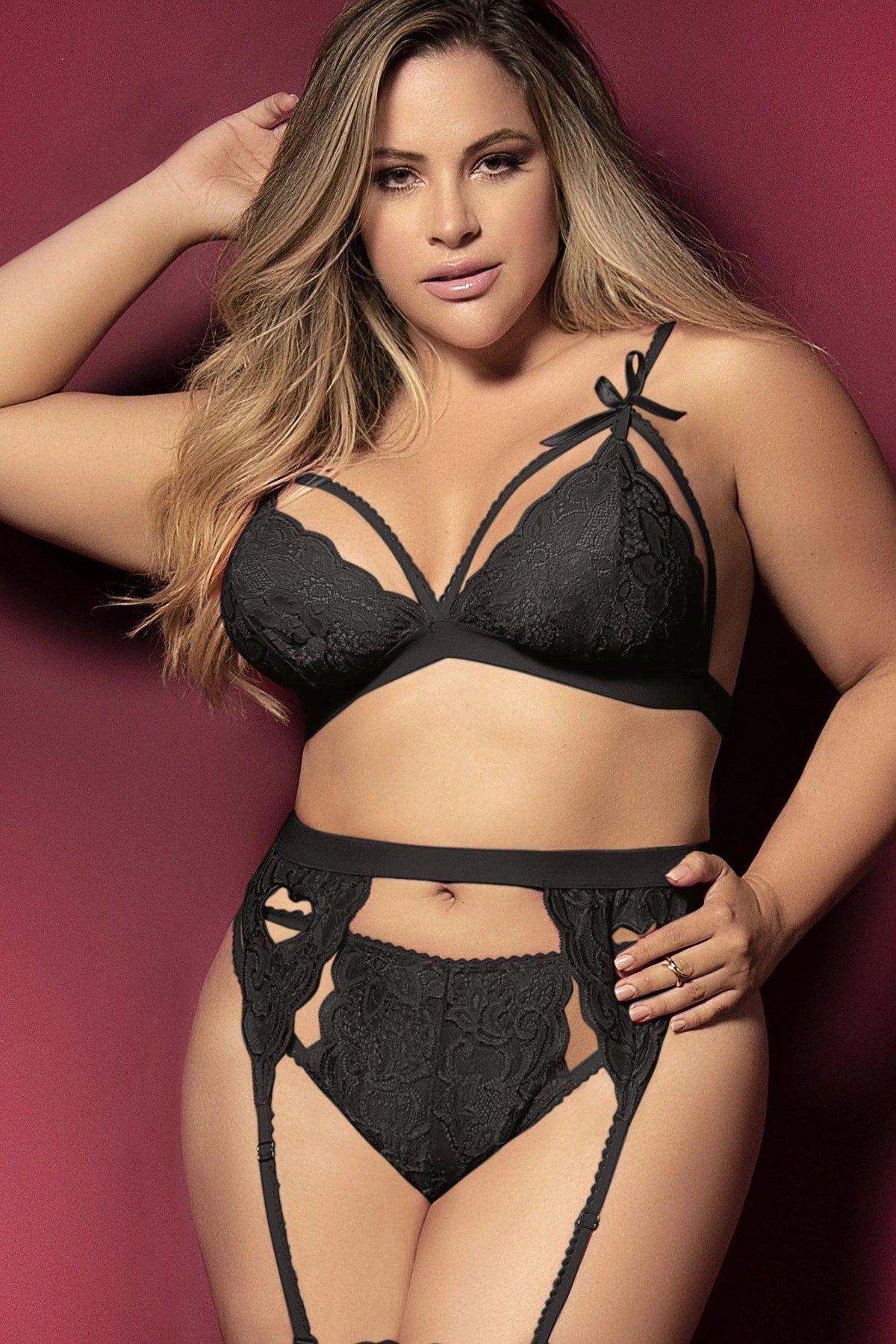 Three-piece lace set features a bra. thong and garter belt. Garter and thong feature sexy heart designs perfect for a romantic occasion. Top has decorative bows. adjustable straps and a clip in the back. Thigh-highs not included but sold in our catalog. Made in Colombia - South America with USA and Colombian fabrics.