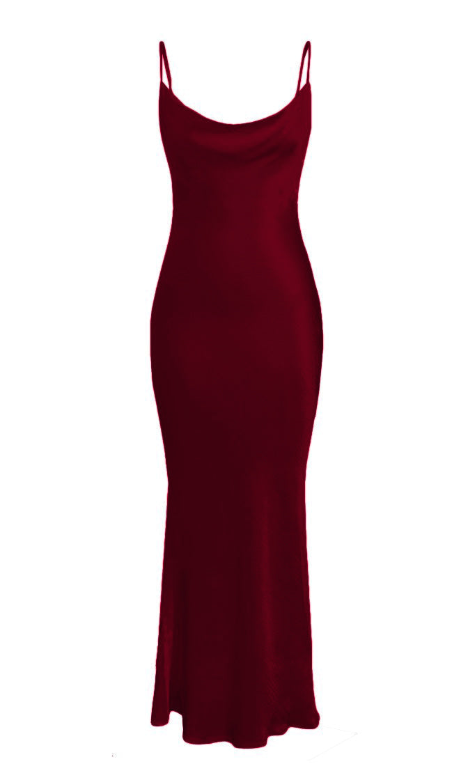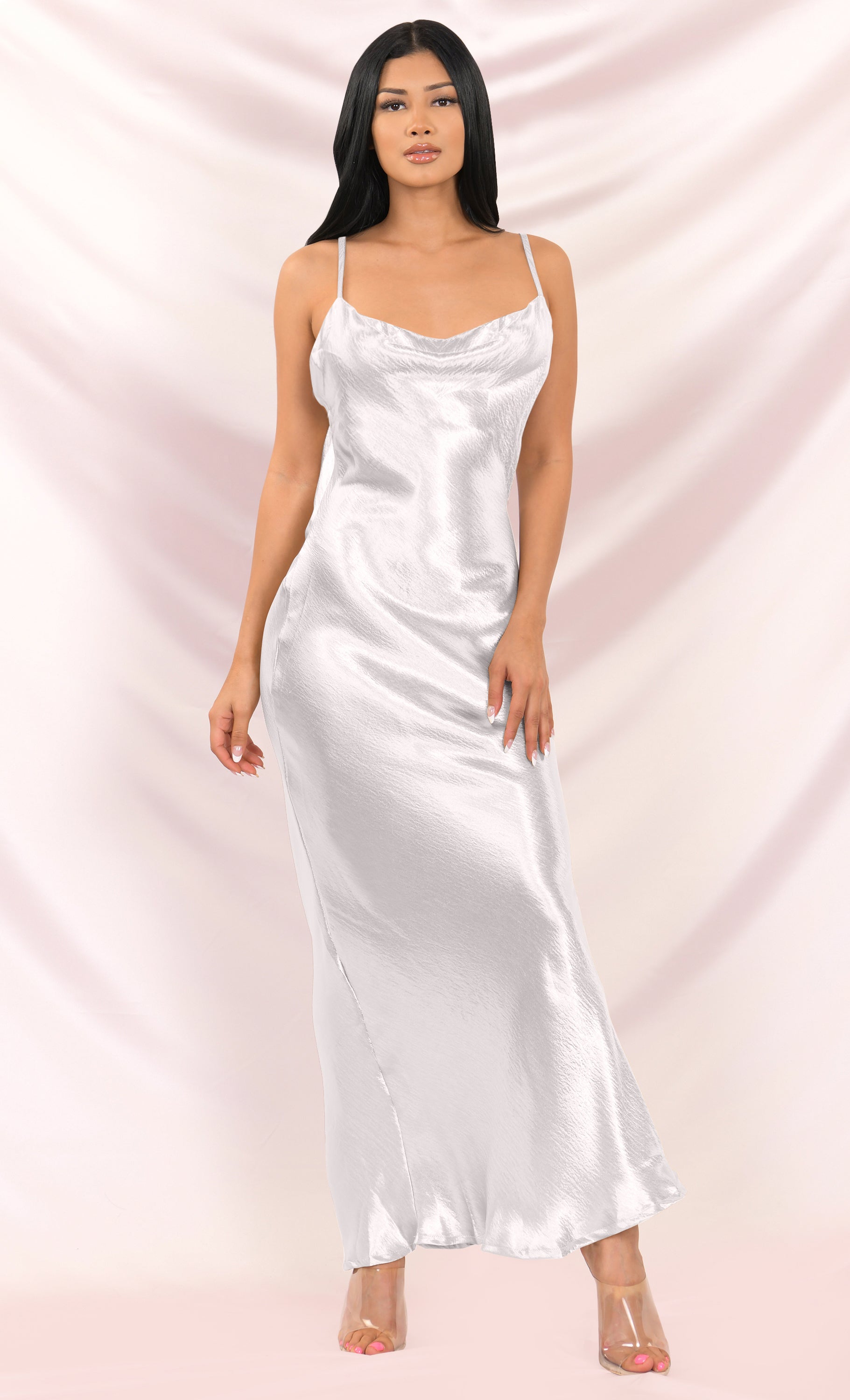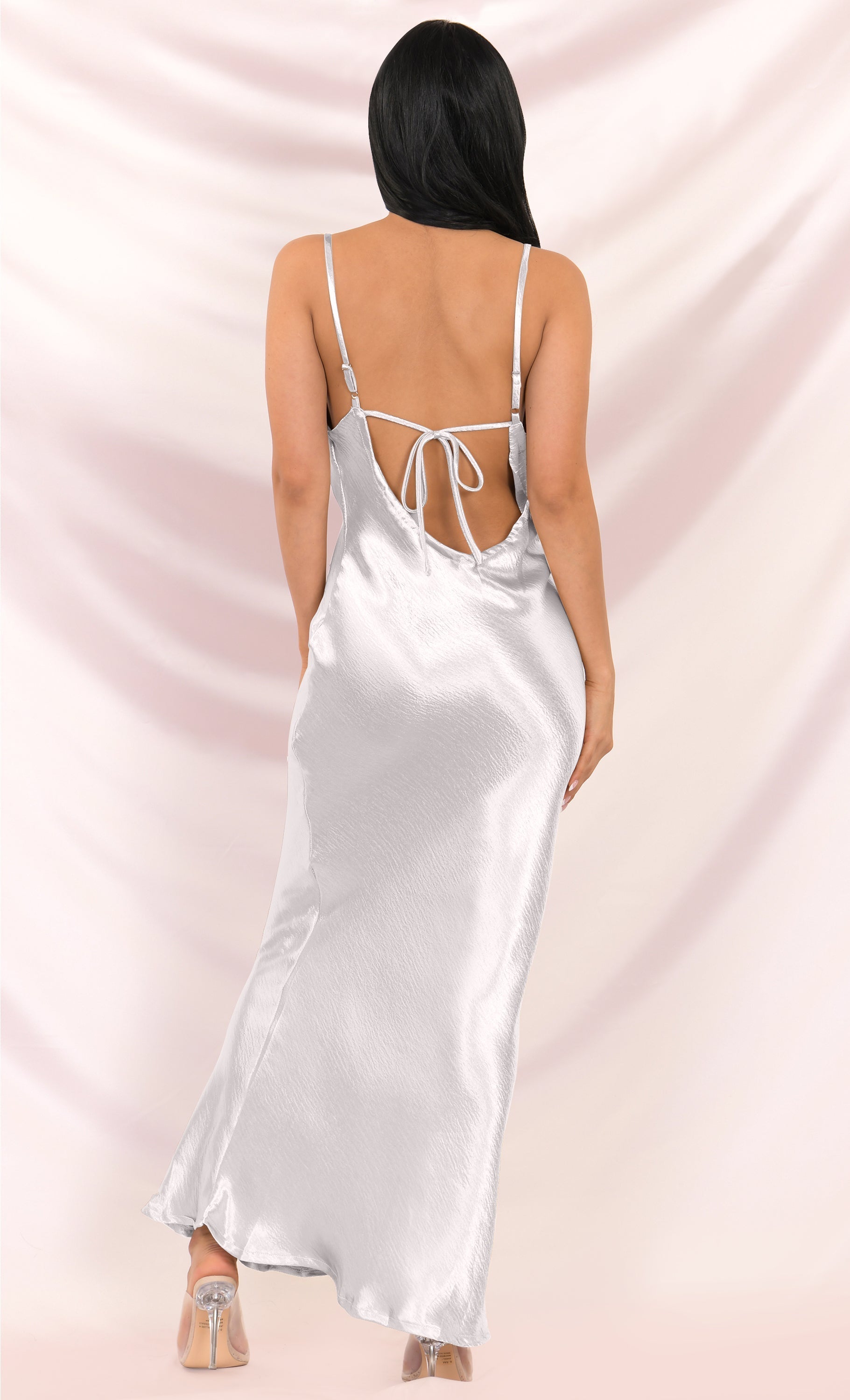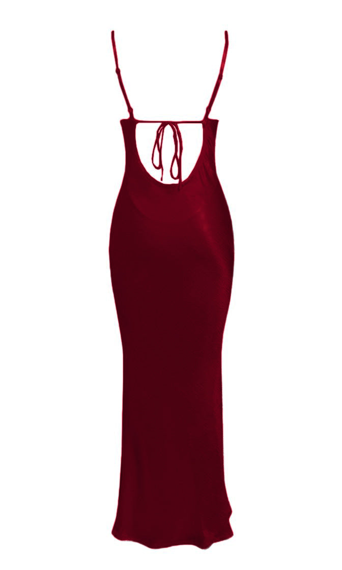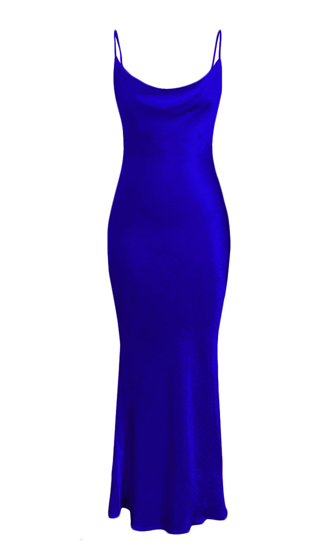 Elegant and chic. this maxi dress is perfect for any formal event or special occasion. The Acceptance Speech sheath gown features spaghetti straps. a draped cowl neckline. and a cut out back with a string tie. Pair this satin gown with strappy heels and statement earrings for the perfect head to toe look.