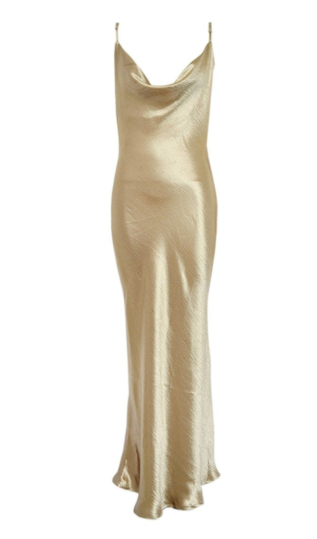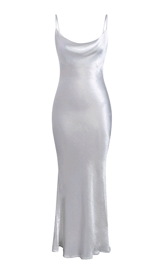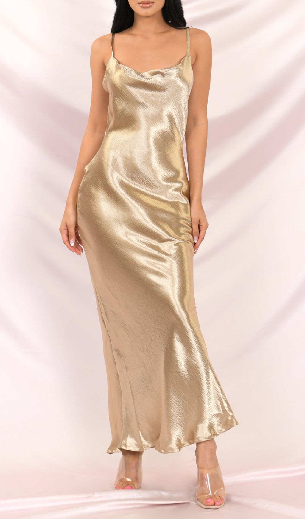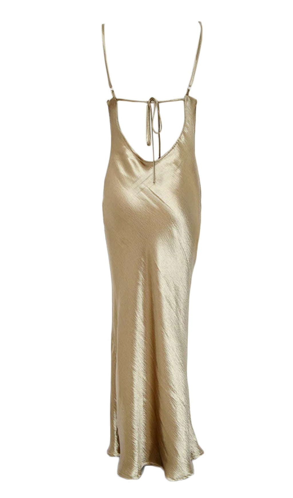 Elegant and chic. this maxi dress is perfect for any formal event or special occasion. The Acceptance Speech sheath gown features spaghetti straps. a draped cowl neckline. and a cut out back with a string tie. Pair this satin gown with strappy heels and statement earrings for the perfect head to toe look.