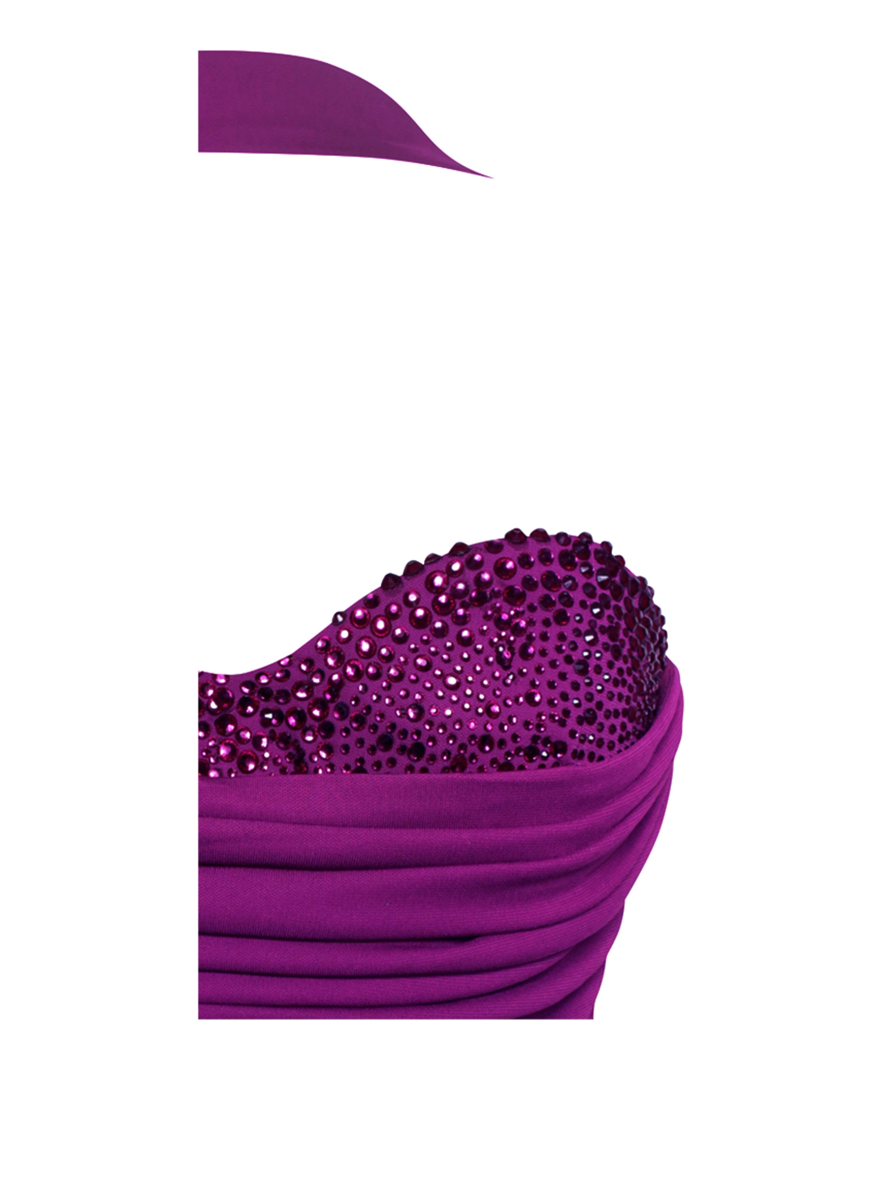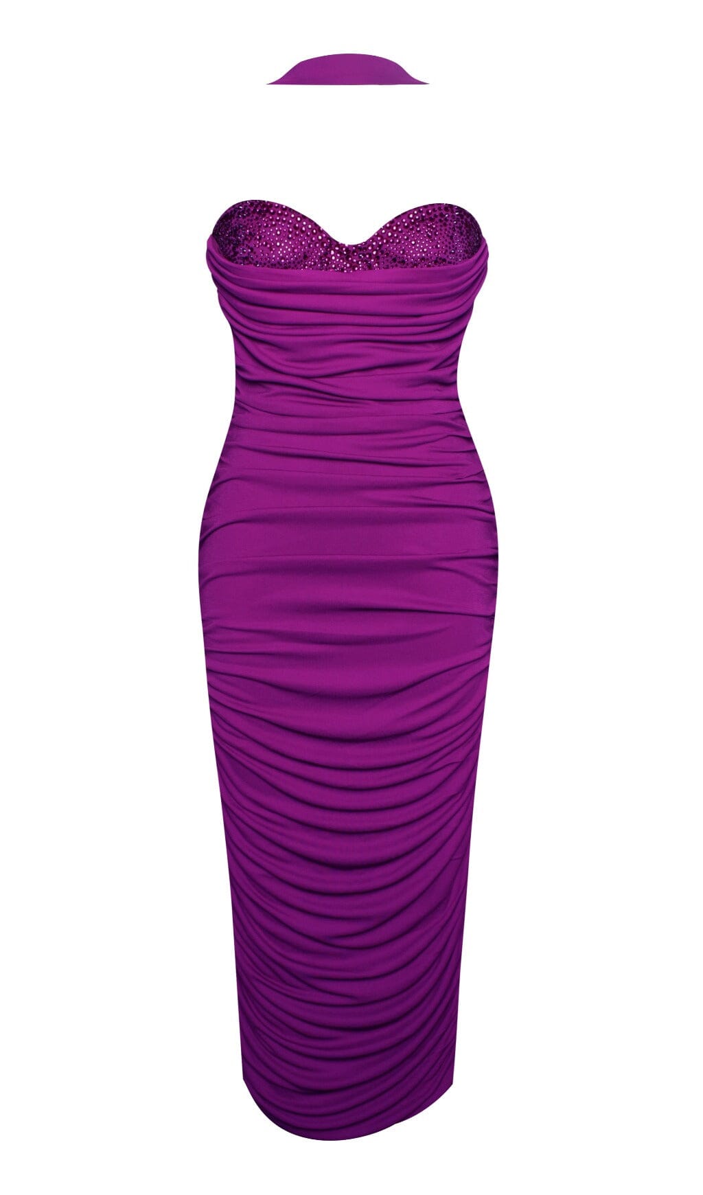 Made from a luxurious stretch crepe fabric. this dress hugs your curves in all the right places. accentuating your figure and making you feel confident and sexy.Features a chic halter neck with a crystal accent at the front. adding a touch of glamour and sophistication. The midi length hemline is both elegant and playful. allowing you to show off your legs while still feeling covered up.