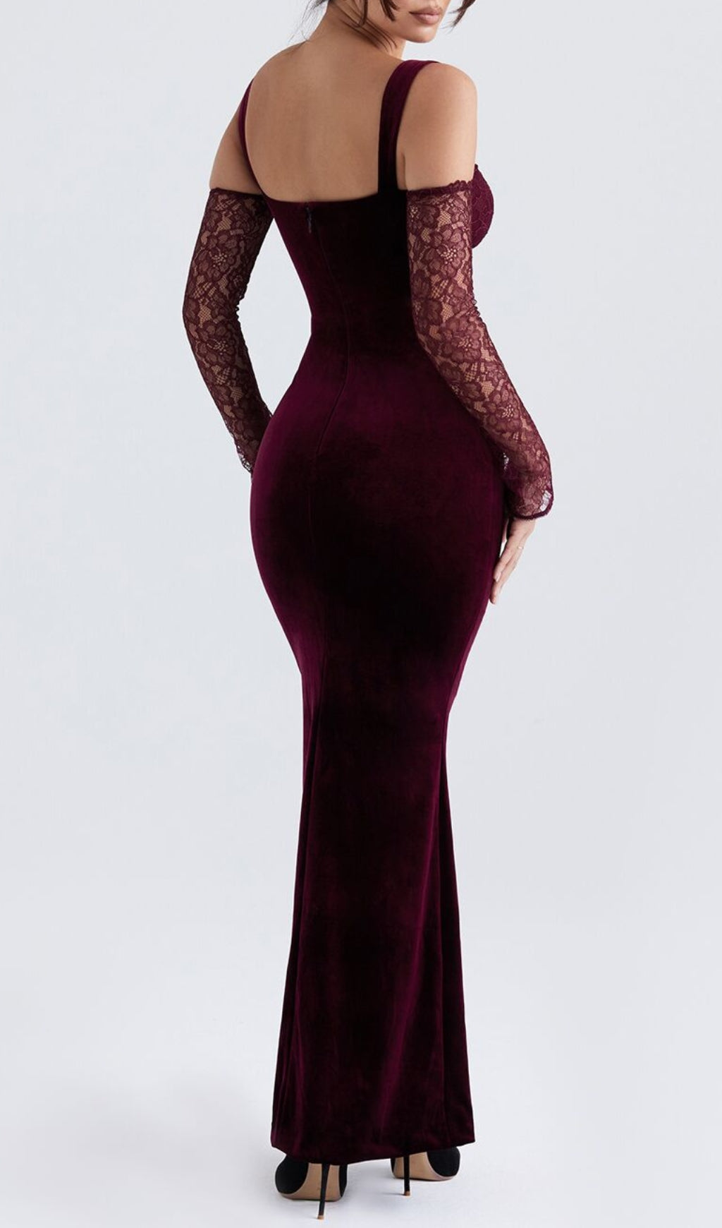 Our BLACKCHERRY VELVET MAXI DRESS oozes drama and glamour. Cut from sumptuously soft stretch velvet in a black cherry hue. hugs the figure to enhance your curves. The pretty lace cups are underwired for flattering support and the delicate lace sleeves add elegant drama.