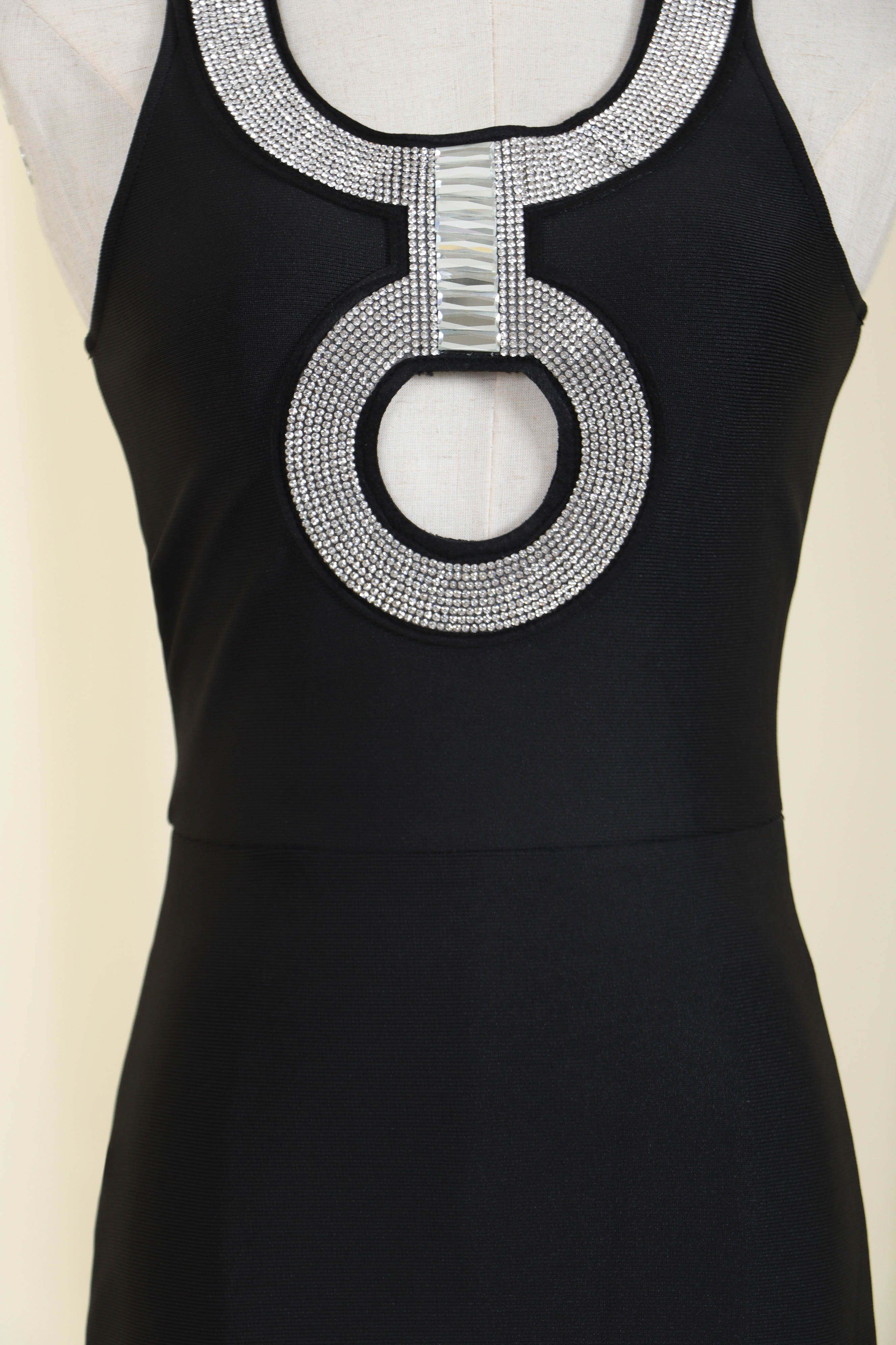 Update your new season wardrobe with our Black Crystal Cutout MaxiBandage Dress. The dressis constructed from our ever-famous stretch bandage fabric to caress your curves and create a perfect silhouette.Pair with your favorite heels and you'll be ready for date night.