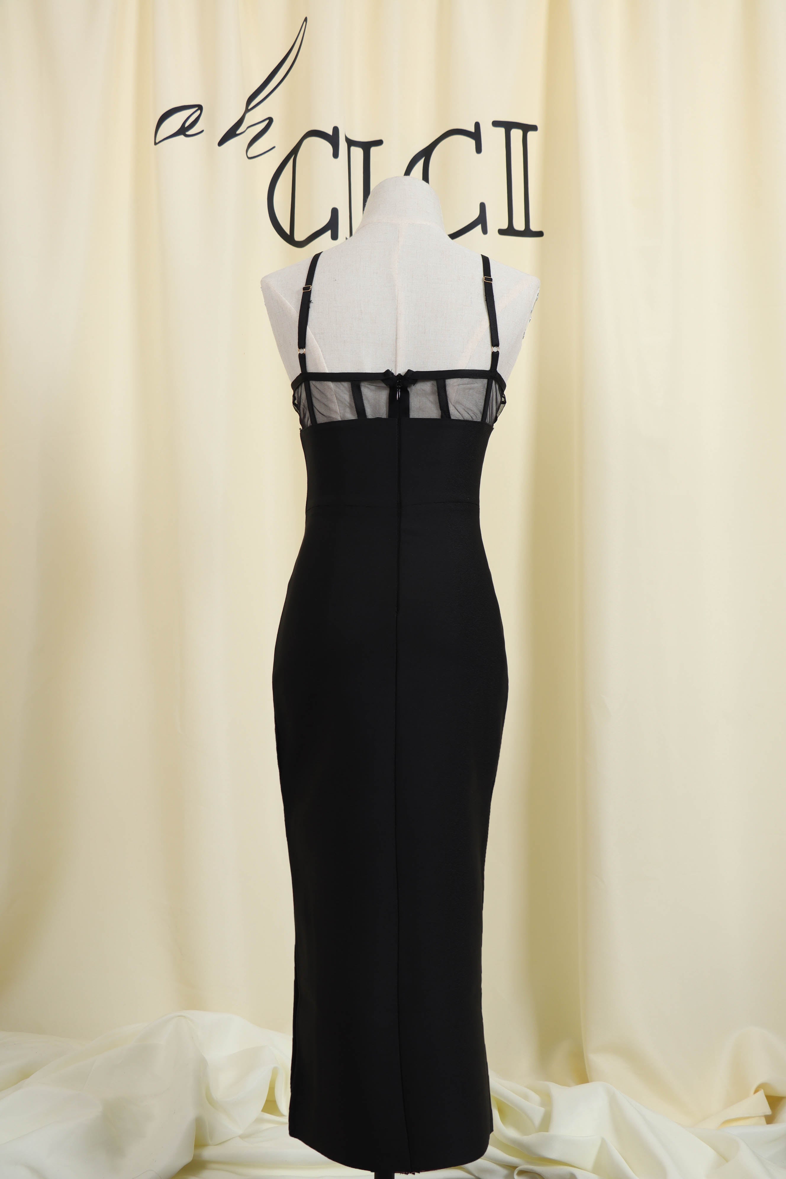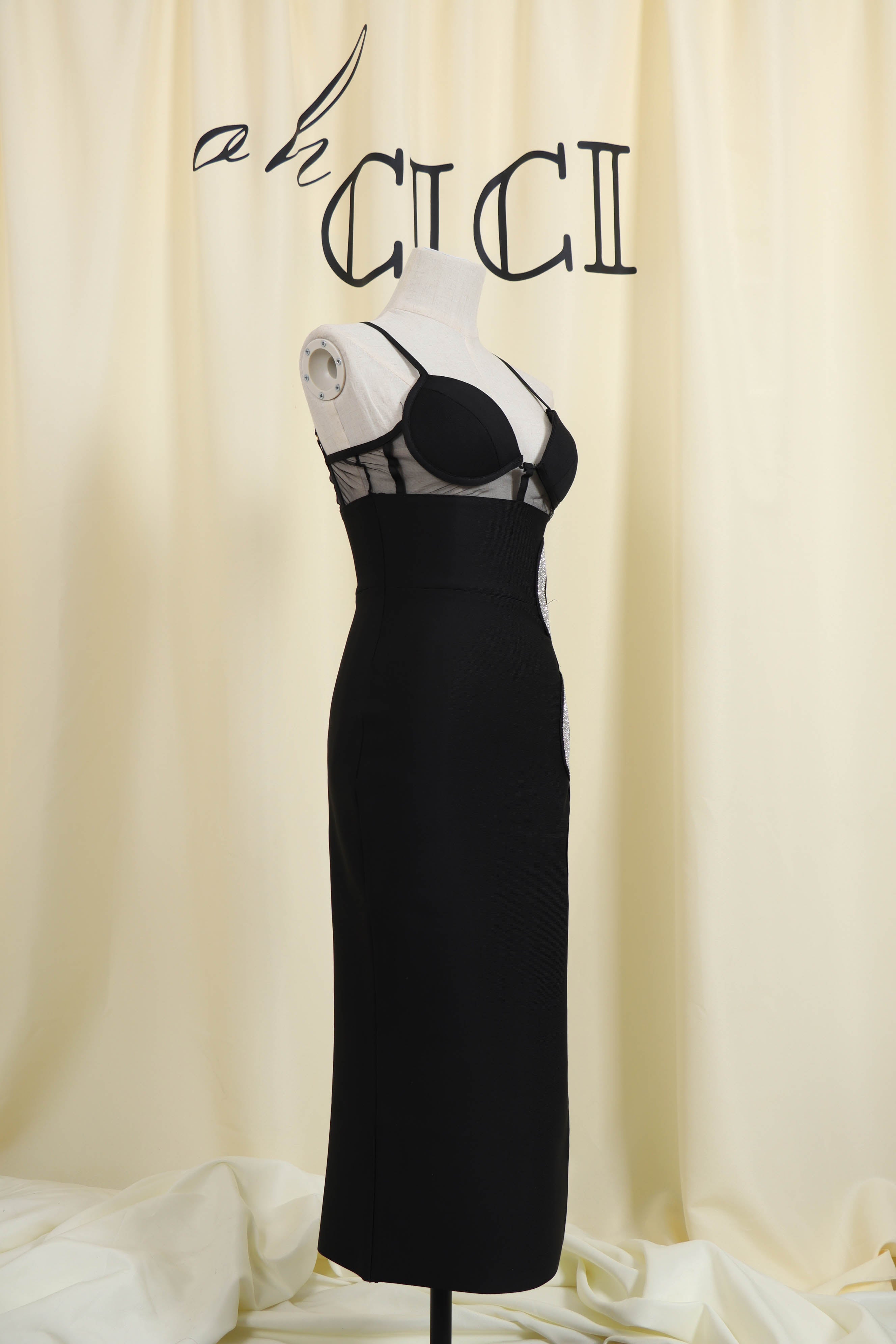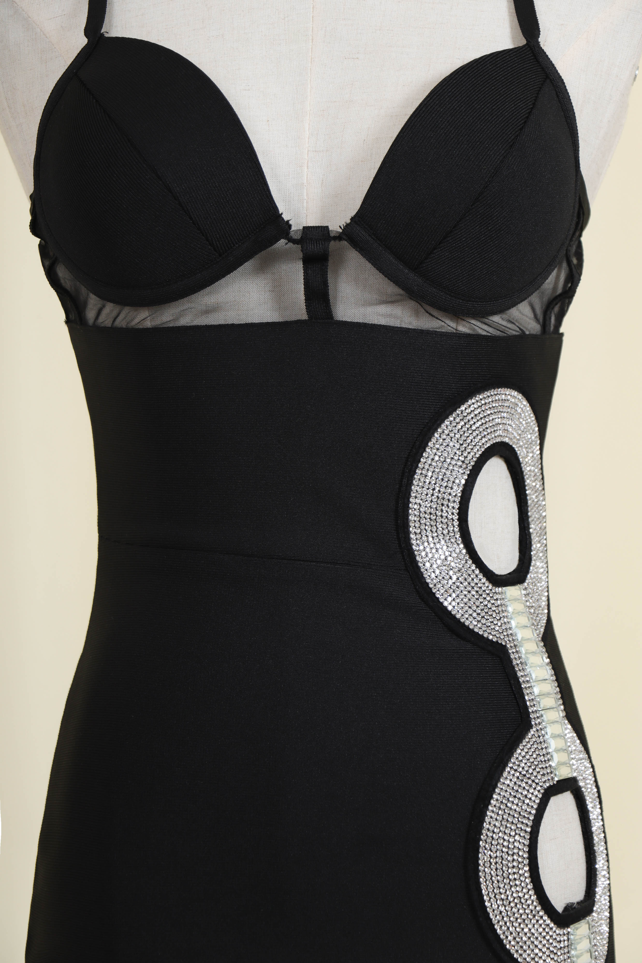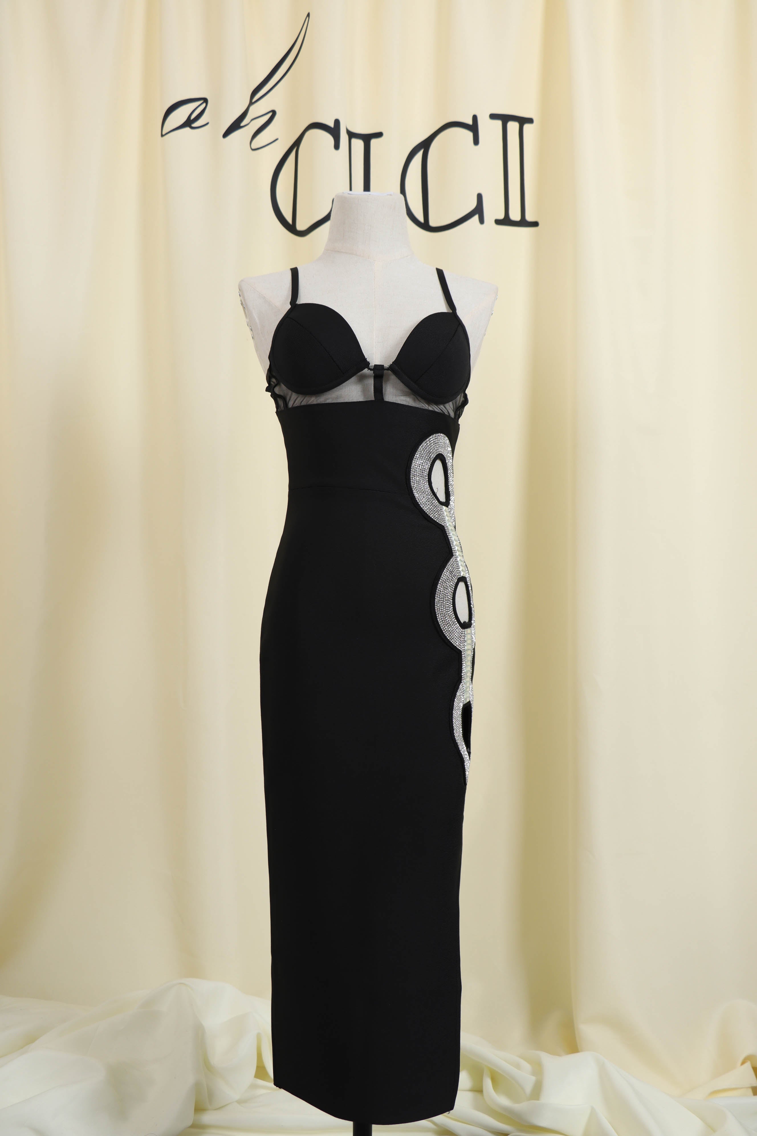 Update your new season wardrobe with our Black Crystal Cutout Midi Bandage Dress. The dressis constructed from our ever-famous stretch bandage fabric to caress your curves and create a perfect silhouette.Pair with your favorite heels and you'll be ready for date night.