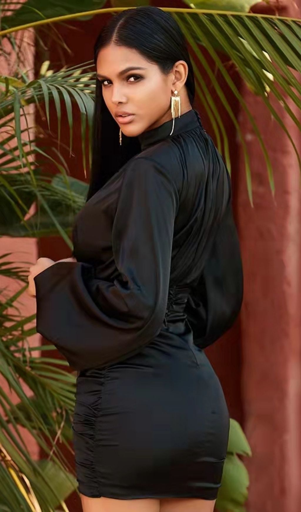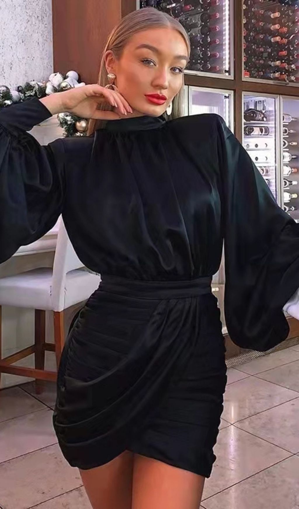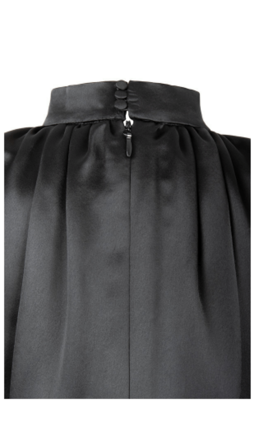Power dressing meets feminine elegance.It is made from our heavyweight. lustrous luxurious satin. It has a beautiful fluidity and incredible draping properties due to the heavy nature of the satin. The elegant high gathered neckline drapes beautifully down the body and the shoulders are lightly padded for structure and feature gathers across the shoulder tops to further exaggerate the draping. It has an ultra deep waistband for serious waist cinching and to really define the shape. We love the overly dramatic waterfall drape to the skirt and the fact that the side gathers to the hips exaggerate the curves. The skirt rises at the centre front where the drapes cross to expose a little flash of thigh and the sleeves are long and narrow to add to the sleek put-together vibe of this dress. It's fully lined of course as is to be expected and gives a smooth and seam free finish.
