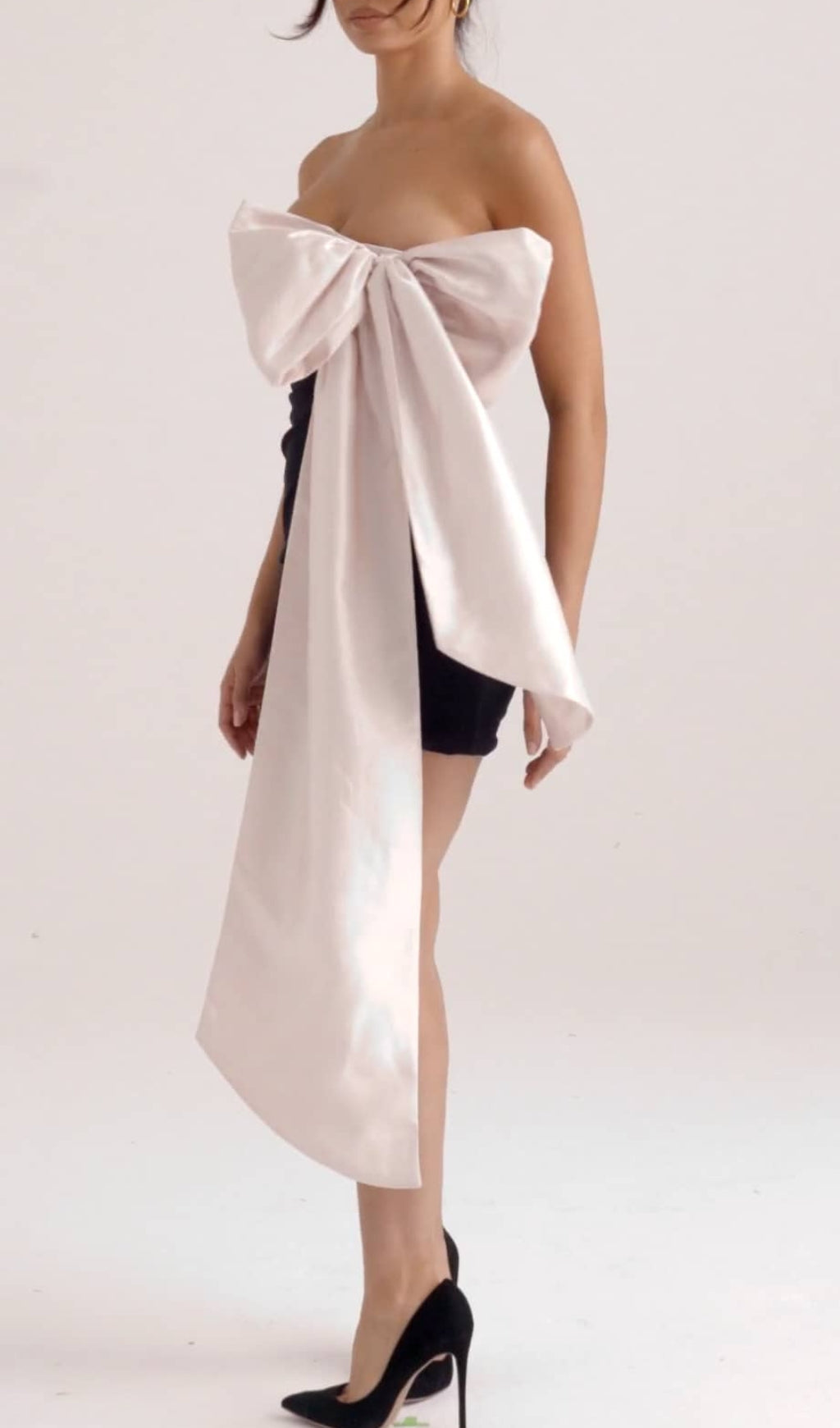 This bow mini dress has a snug fitting silhouette in a thigh grazing mini length and we love the ultra dramatic. oversized bow that cascades into a sweeping train to make the most glamorous statement. It zips to the side for easy on and is fully lined of course for a smooth seamless finish.