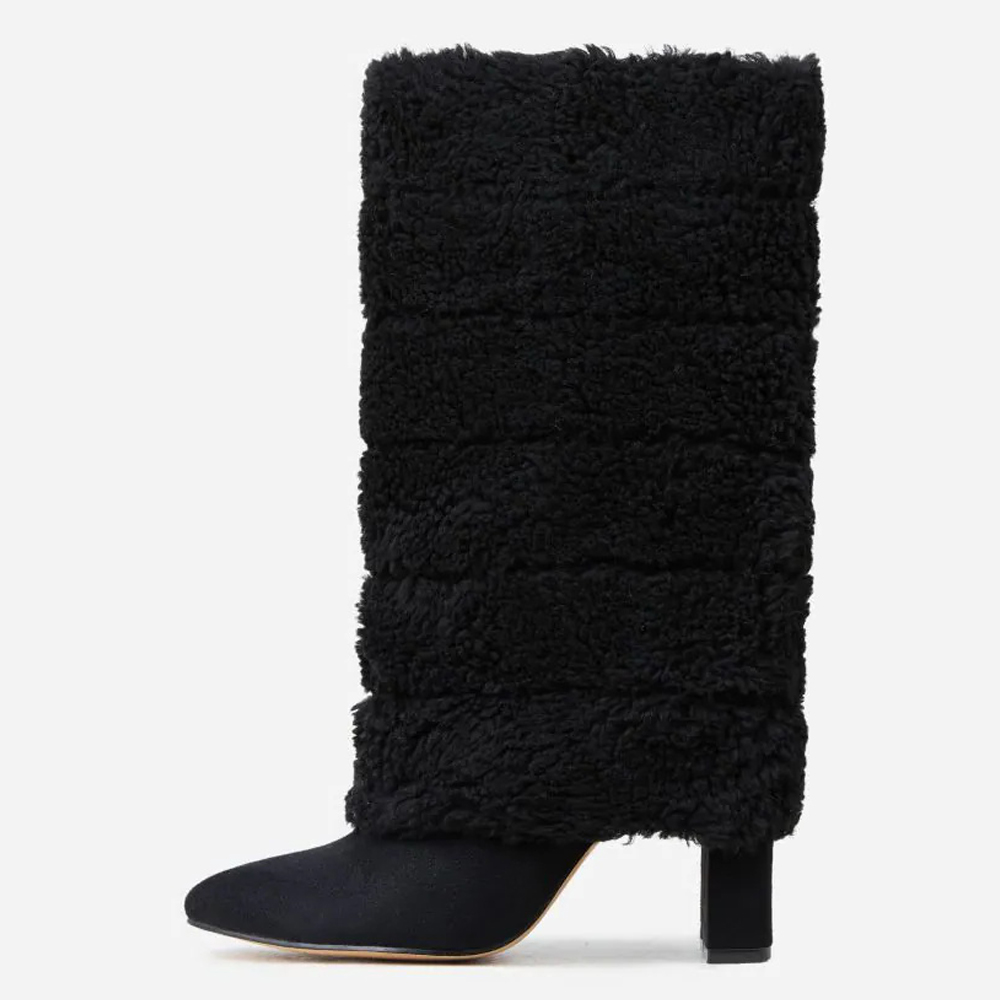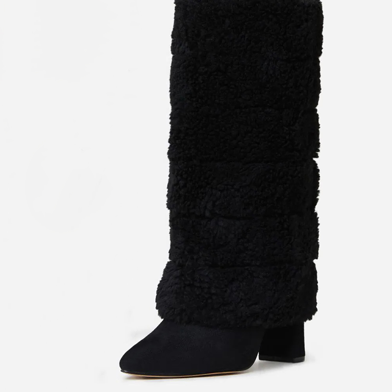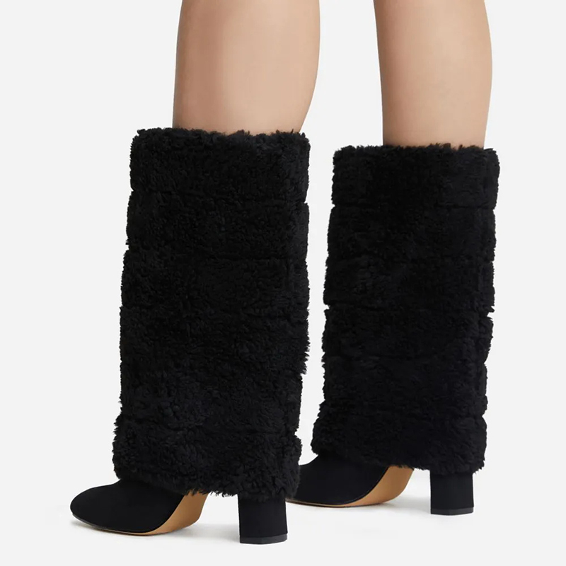| Name | Black Fold-over Mid Calf 4-inch Chunky Heel Faux Fur Boots for Women |