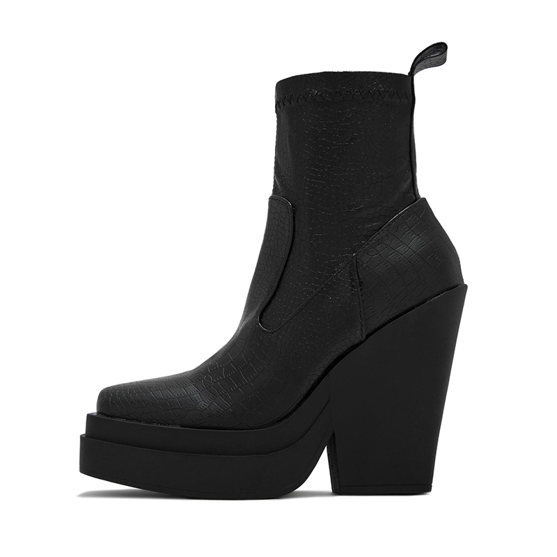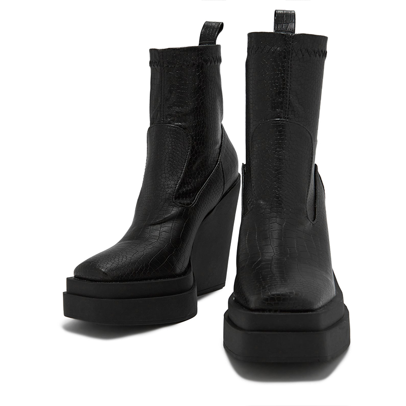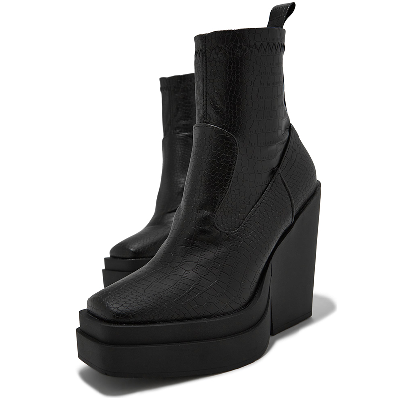 | Name | Classic Black Square Toe Croco Embossed Block Heel Ankle Boots |