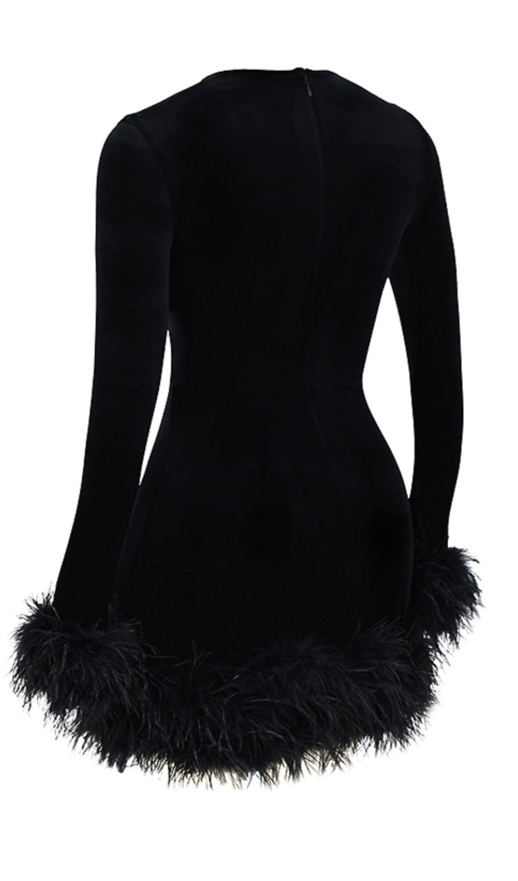 The glamorous design of our black velvet dress will take you from champagne bars to parties. Cut from plush black stretch velvet. this LBD has a simple rounded neckline and lets the dramatic feathered hem do the talking. As you'd expect from HOCB the body is fully lined for the smoothest finish. It zips up the back for easy on and is suitable for any bust size as it has no cups.