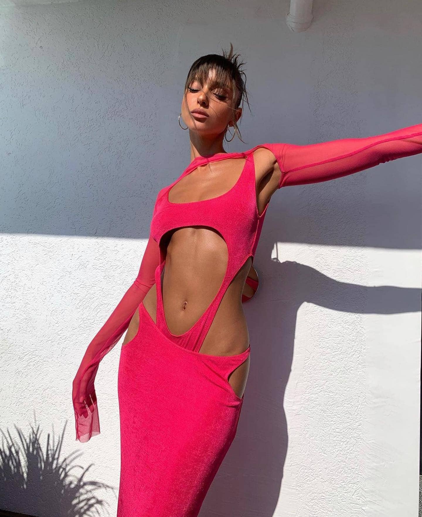 The Cut-Out Hip Wrap Midi Dress in Pink by Style of CB is a gorgeous dress that's perfect for dressing up or going out. It has a figure-hugging silhouette that accentuates curves and a flattering wrap-style waist that highlights the waistline. The bright pink color is eye-catching and the cut-out details give the dress a unique touch. The midi length falls just below the knee. making it versatile for different occasions. It's made of high-quality fabric that is comfortable and durable. and it fits true to size. Overall. it's a beautiful and fashionable dress that will make anyone stand out in a crowd.