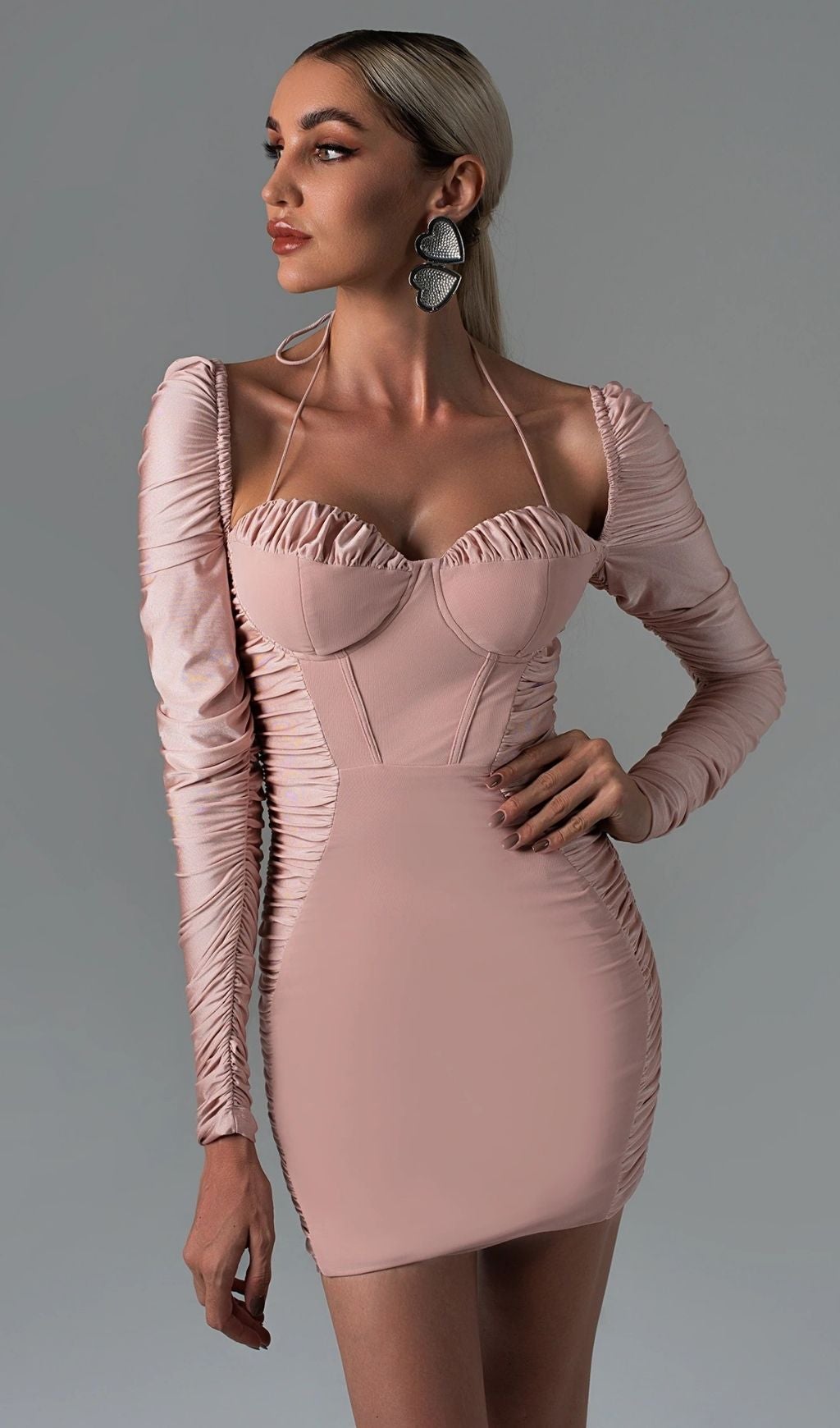 Our mini dress will have you turning heads on your next occasion. babe. Designed in ruched fabric. this body-hugging mini dress features a squared neckline and backless detailing for eye-catching impact. Style with simple strappy sandals for a look that will have everyone double-taking!