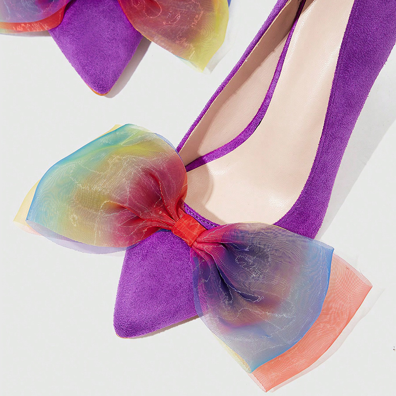 - Crafted from luxurious. soft suede in a stunning purple hue. these shoes feature an ultra-feminine pointed toe and delicate multicolor bow accents giving them a unique. playful twist. The slender stiletto heel enhances your silhouette. exuding confidence with every step. Perfect for both office wear and evening outings. these pumps offer versatility and a splash of color to any ensemble. With their high-quality construction and chic design. they're sure to become a cherished part of your shoe collection.