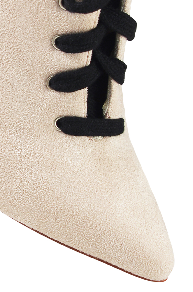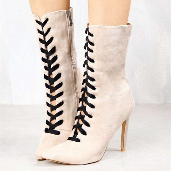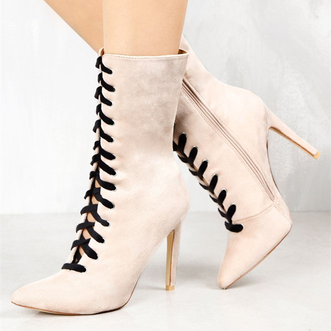 | Name | Fashion Ivory Lace up Boots Soft Vegan Suede Pointy Toe Stiletto Heel Boots |