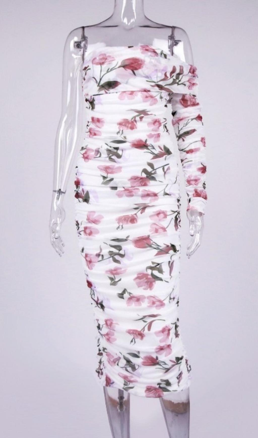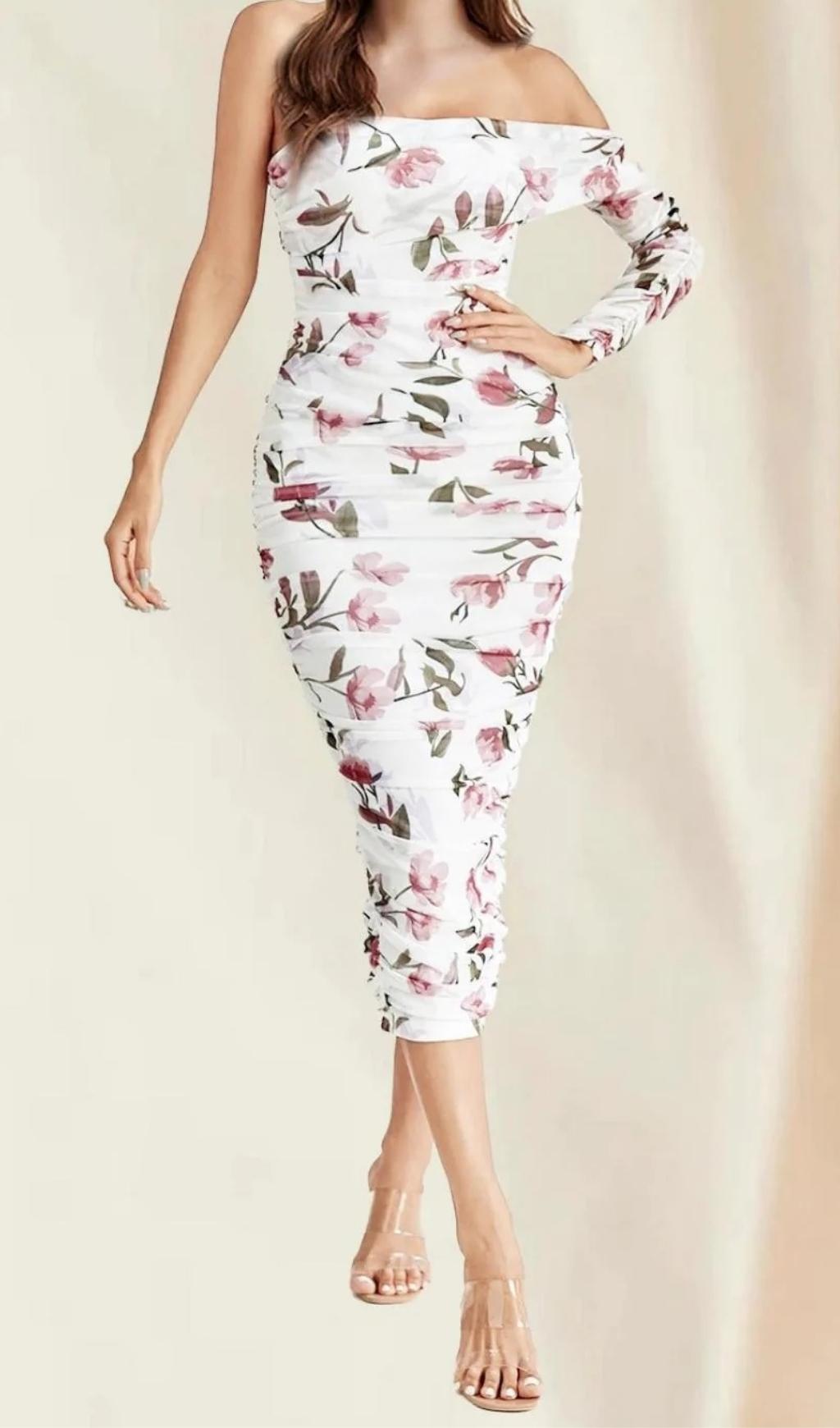 It's the ruching for us. Our pretty. feminine One Shoulder Dress that'll hug your curves. This mesh dress creates a one-shoulder. figure-flattering floral midi dress. Pair with your favourite heels and accessories for the perfect vacation.