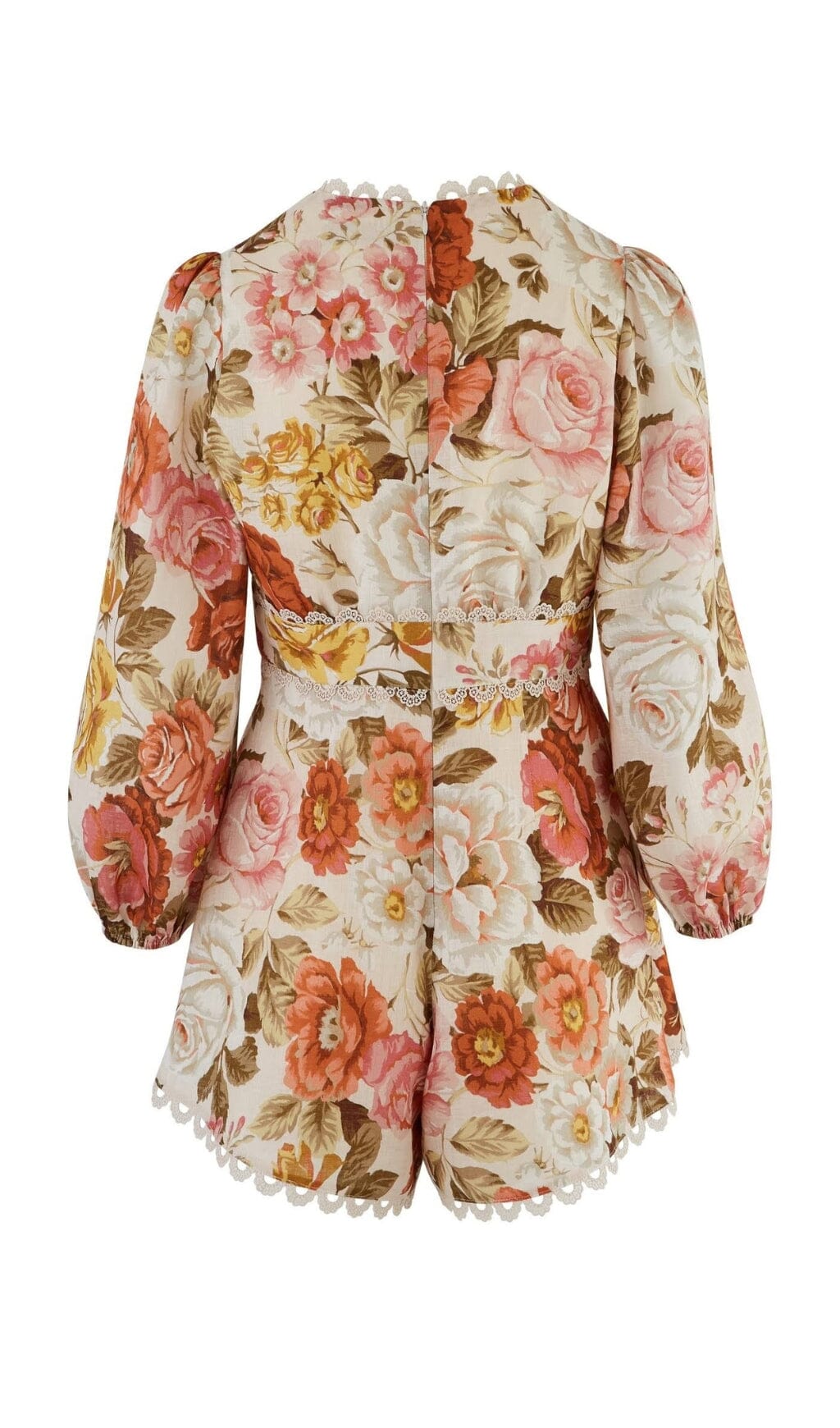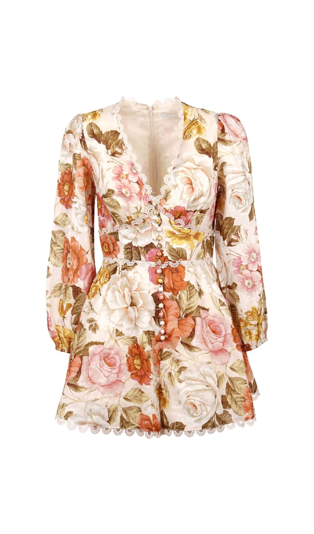 This cream playsuit featuring with a vintage sensibility using antique-inspired florals and delicate scalloped lace. It is shaped to a flattering V-neck with a fitted bodice that's offset by blouson sleeves and a row of decorative buttons. Style it with leather slides and a woven cross-body bag for an afternoon of sightseeing.