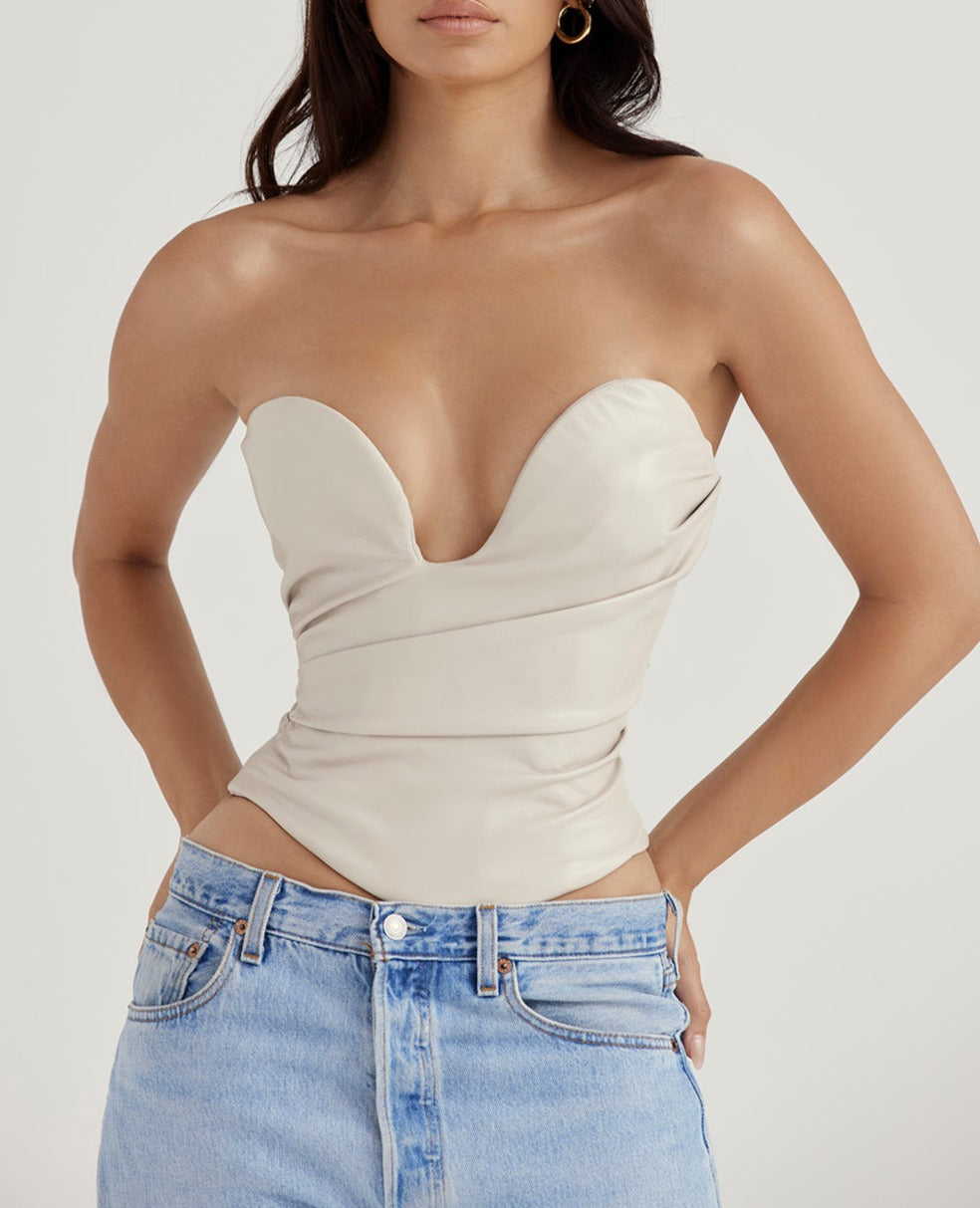 Our plunge corset is the ultimate wear-forever piece and adds a sexy edge to our corset collection. Cut from a soft and buttery stretch vegan leather. it features our incredible corsetry boning to cinch the waist for a structured fit and padded cups to enhance the bust.