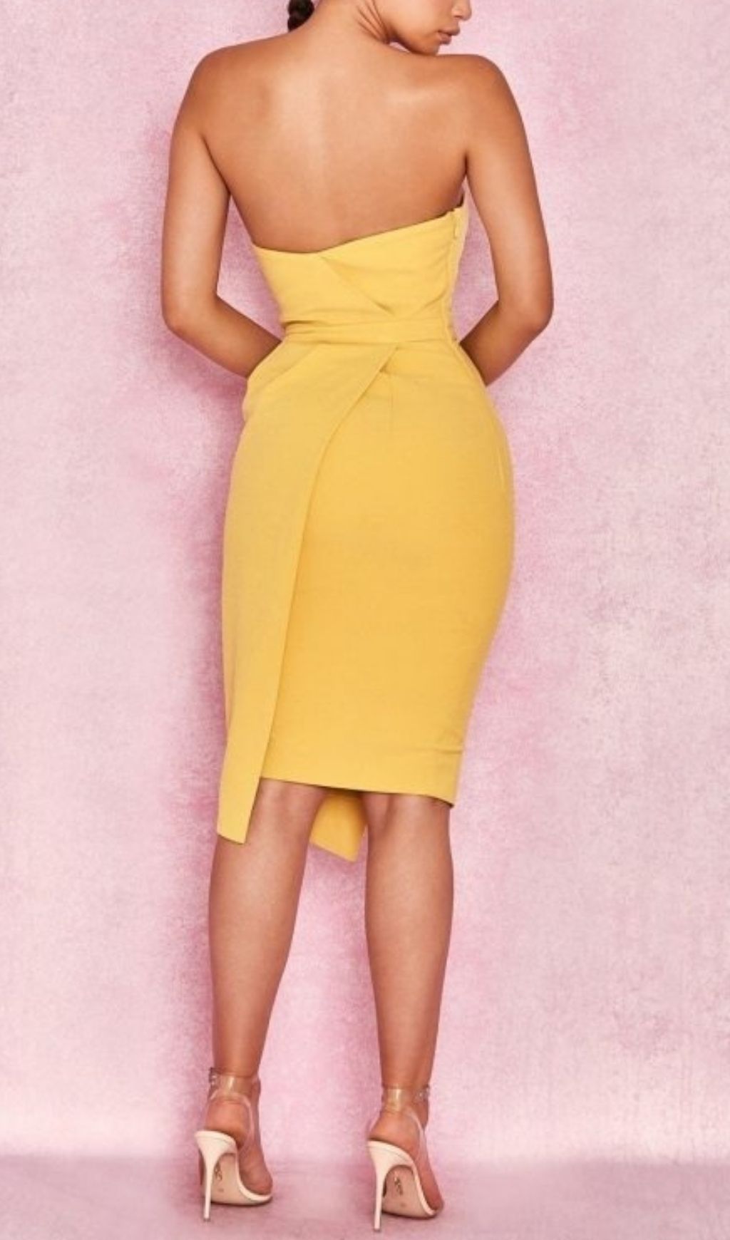 Crafted from our stretch mid-weight crepe and fully lined for a smooth. comfortable fit. it features a striking fold front and asymmetric styling. The strapless structured cut flatters and pushes up the bust. whilst the fitted waistband nips the waist. The look is balanced by a mock wrap effect to the skirt. Wear yours with neutral accessories.