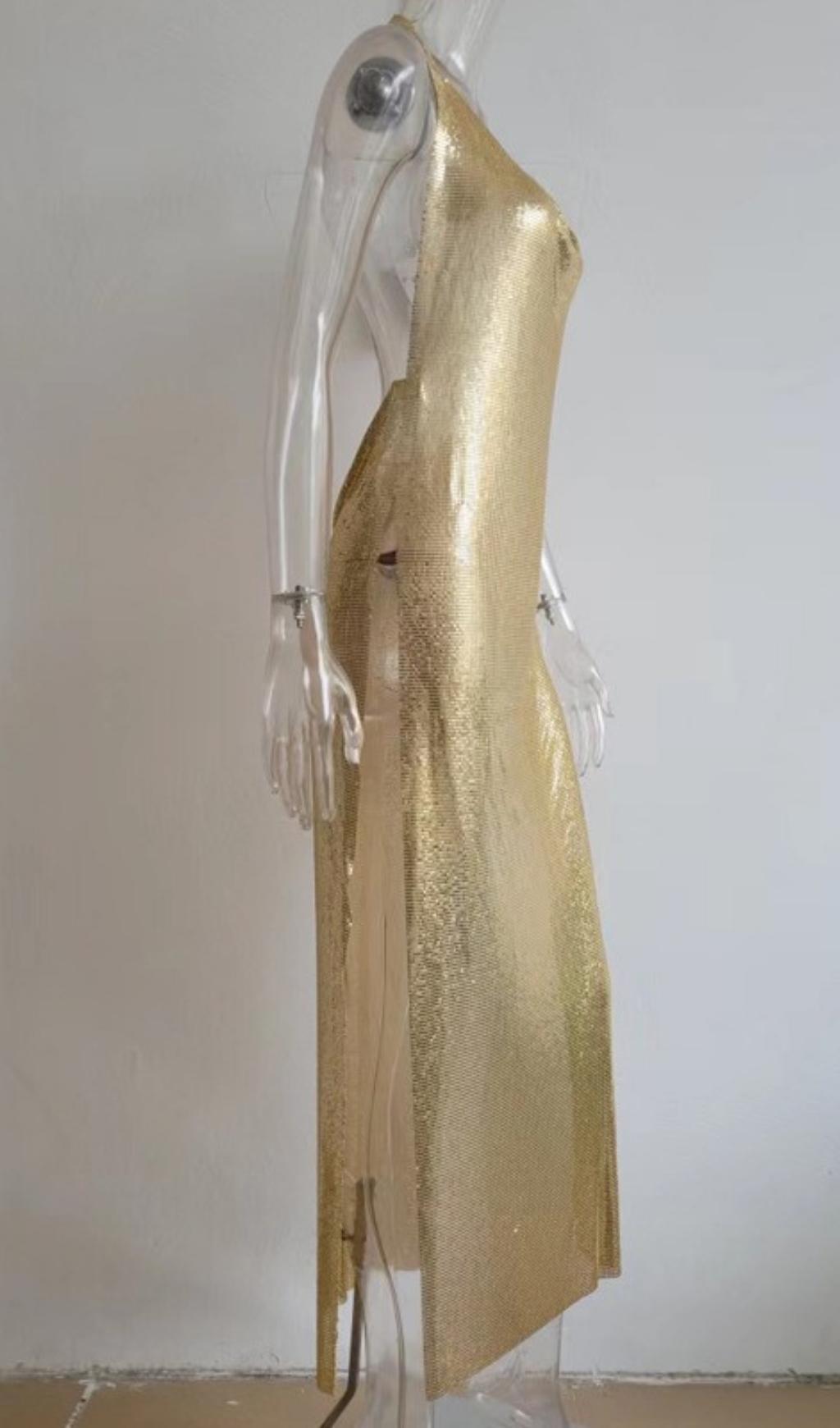 It's the ruching for us. Our pretty. feminine gold backless metallic midi dress that'll hug your curves. Designed with an extreme plunging neckline. to show off your best features this party season.The side split reveals a flash of leg. pair with your favorite heels. It's time to hit the dancefloor!