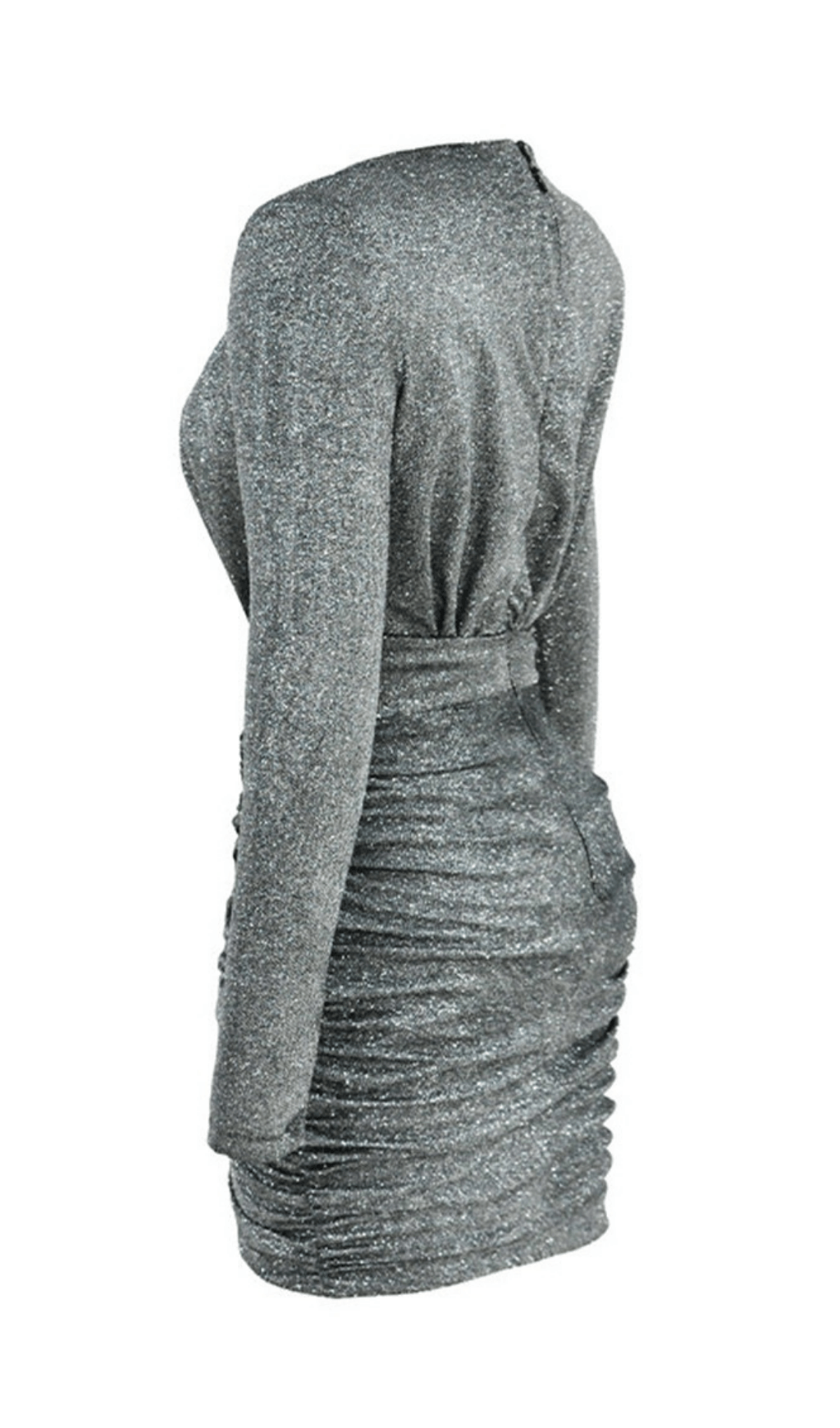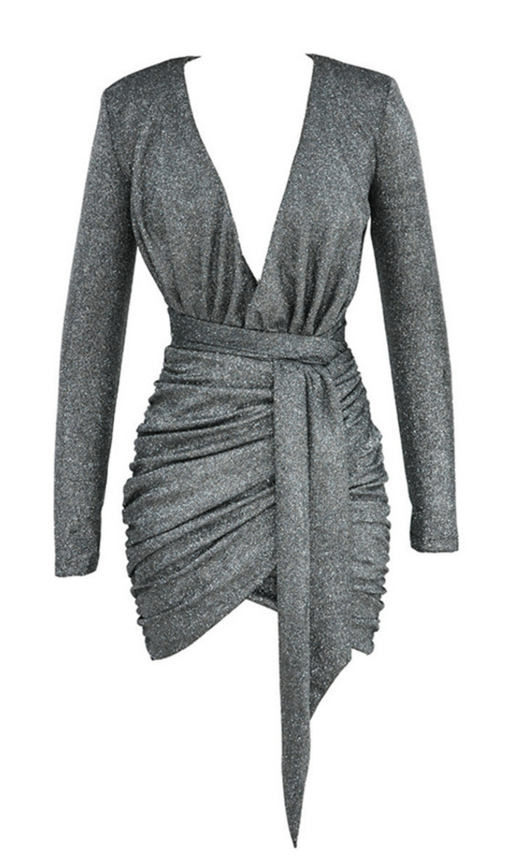 Made of our super shiny fabric. It is fully lined in silk knit and is soft and comfortable to wear. It has a deep V neckline that really tightens the waist of the hourglass figure. We like the way the hem rises on the front of the thigh. and it is made of stretch glitter fabric.