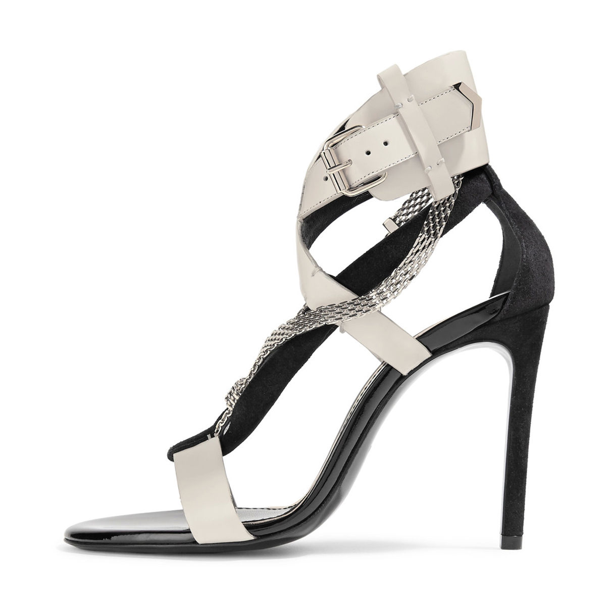 | Name | Grey White Strappy Sandals Open Toe Stiletto Heels with Metal Embellishment |