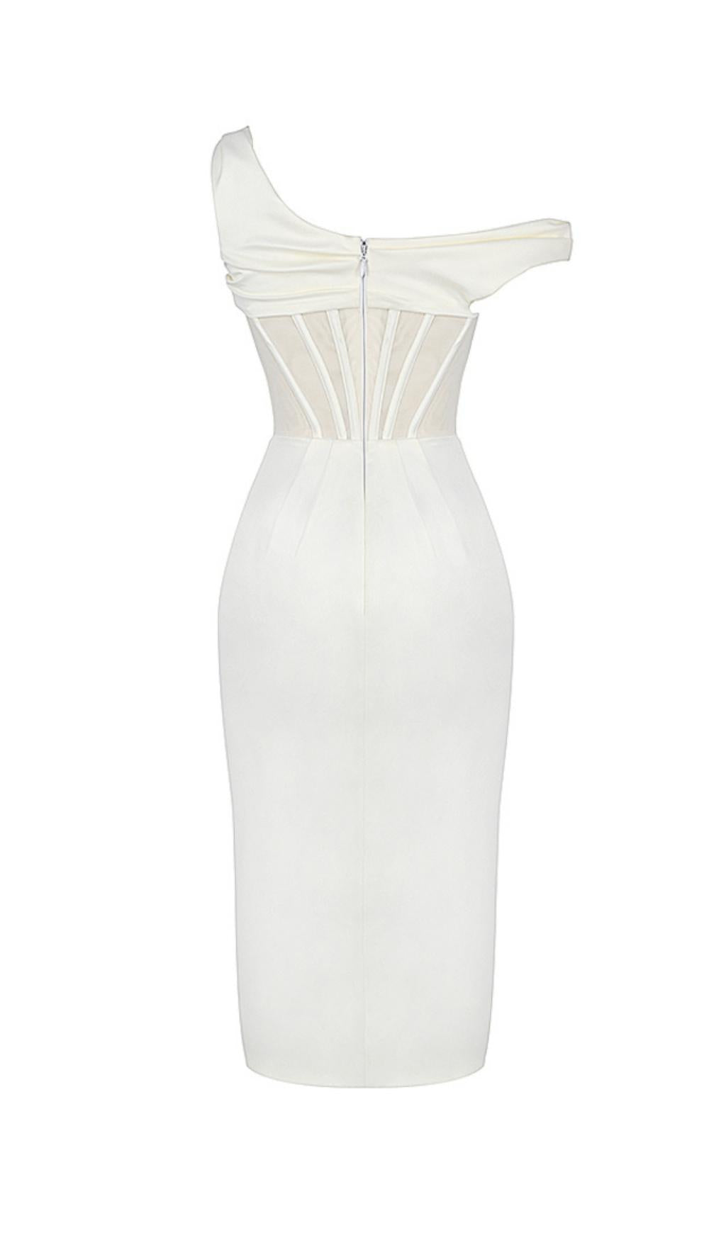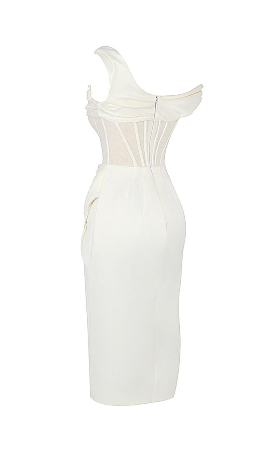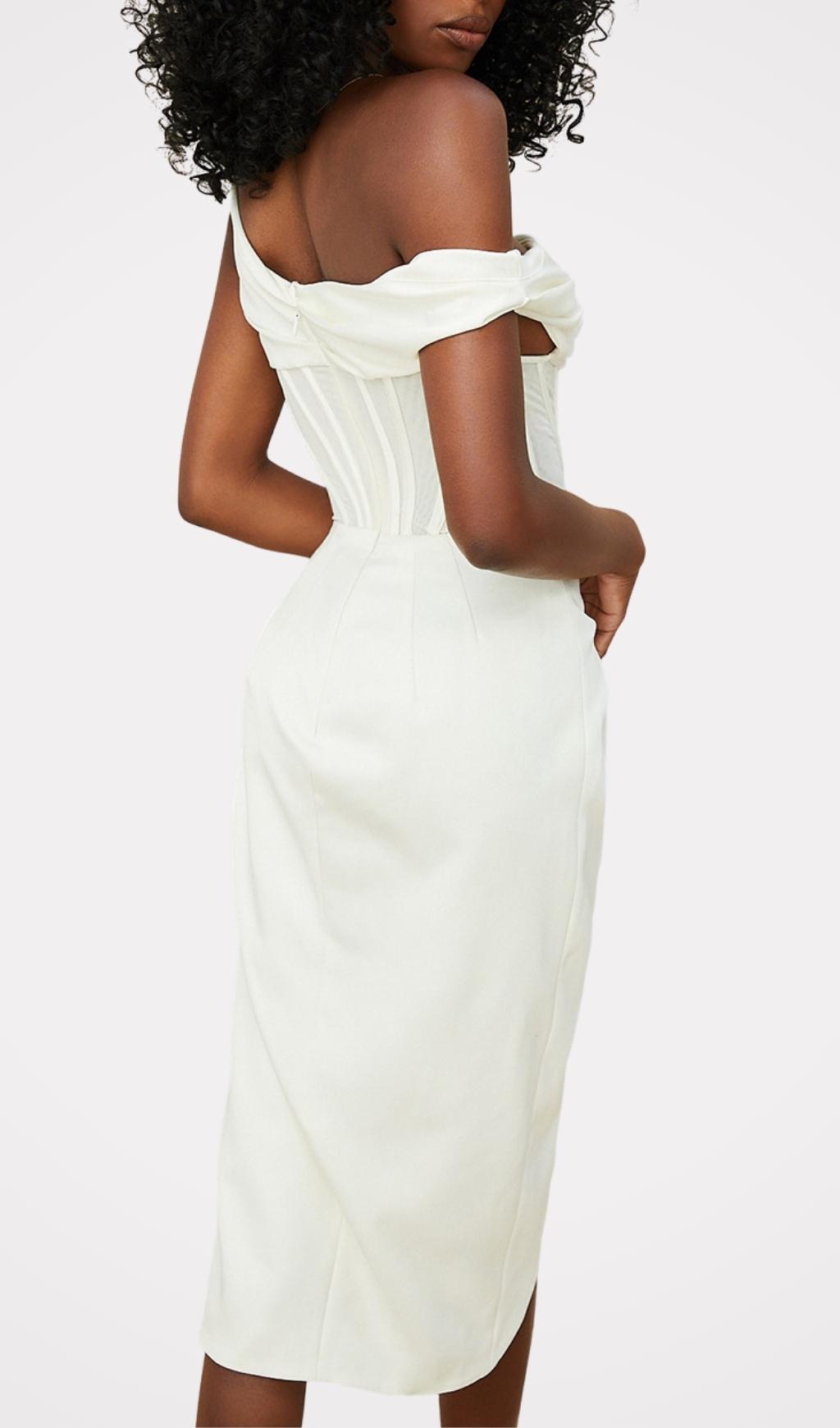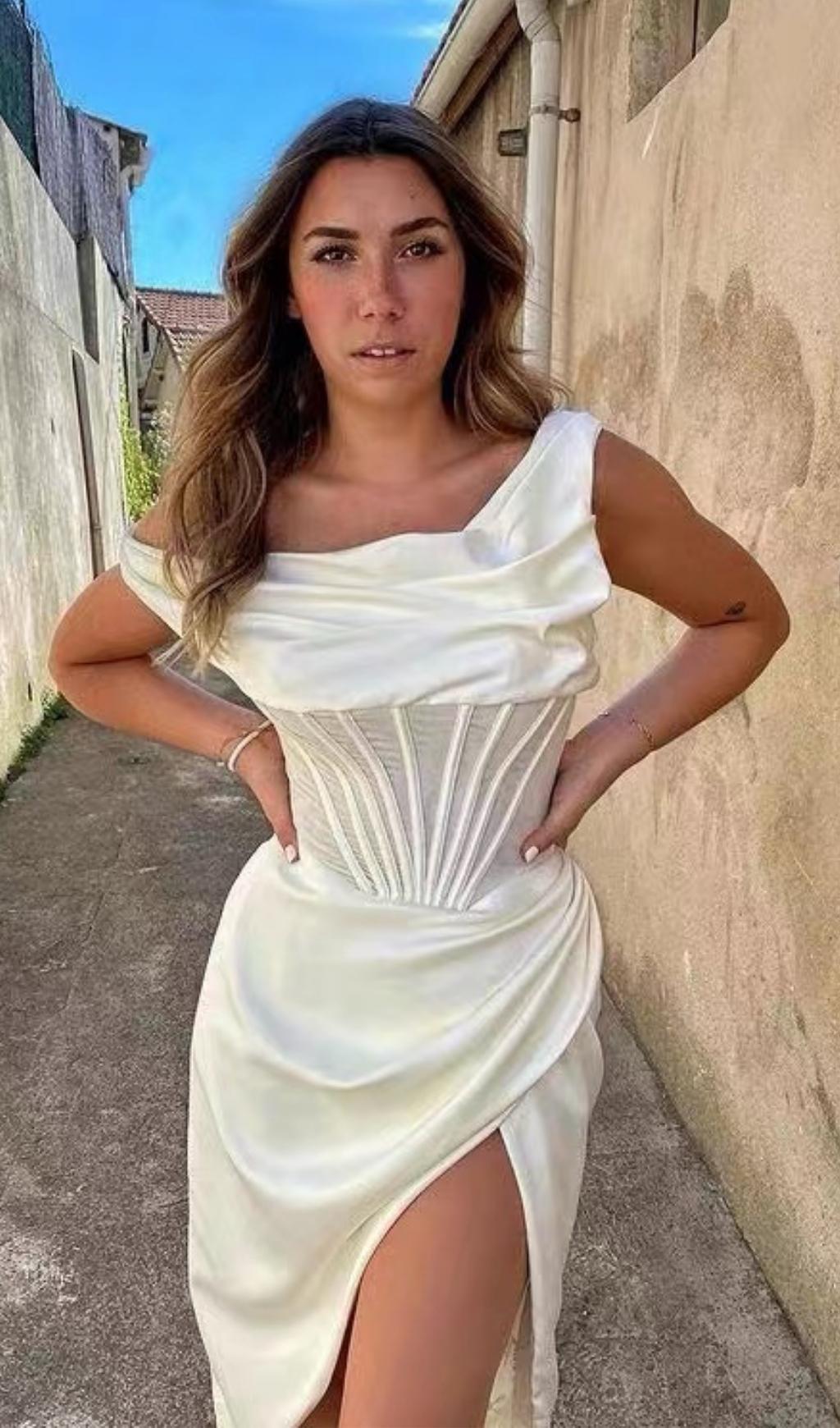 Our super sexy and stylish one shoulder drape creation with a touch of elegance in a soft ivory tone. Crafted from our ultra luxe duchess satin featuring our special boned corsetry that gives ultimate support for a sculpted fit. The internal layer is made from our special stretch power mesh that sculpts the figure from within and acts like shape wear but is built into the garment. It is boned through the front and back and features additional 'side boob' boning to create the most flattering cleavage by pushing together and uplifting the bust.